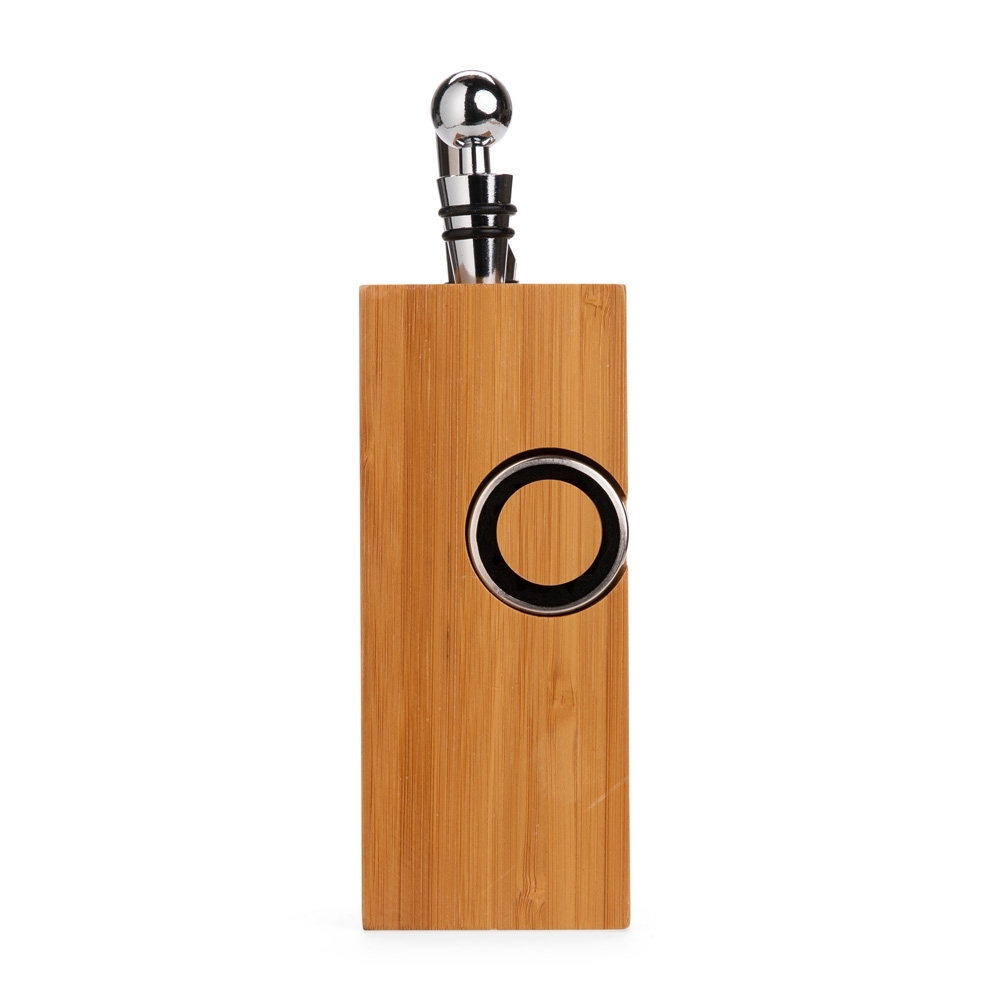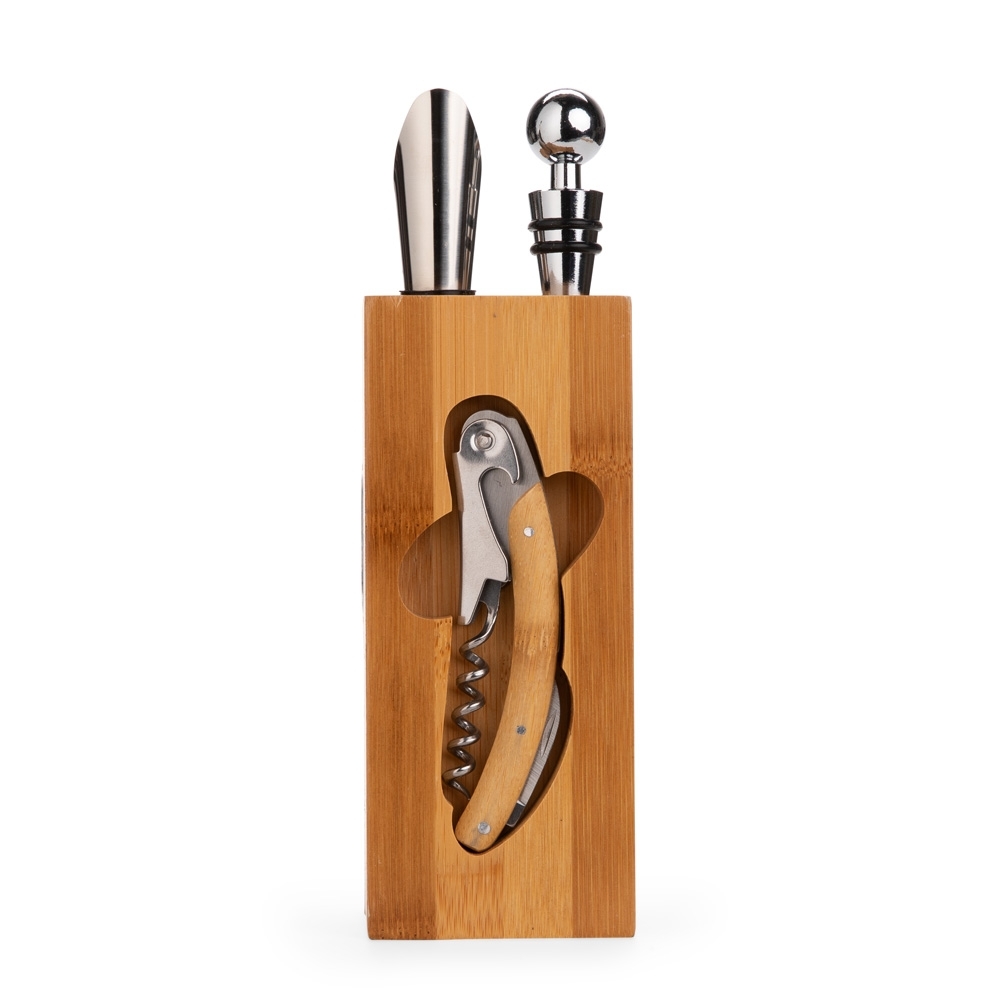 Kit vinho composto por 6 itens: saca-rolhas de um estágio em inox com cabo de bambu, dois anéis corta-gotas (wine collar) em liga de zinco e feltro, termômetro em vidro com detalhes em liga de zinco, além de bico dosador em liga de zinco com detalhes em silicone e tampa de bico em inox, com partes em zinco e silicone. Acompanha suporte em bambu para acomodar os itens do conjunto.