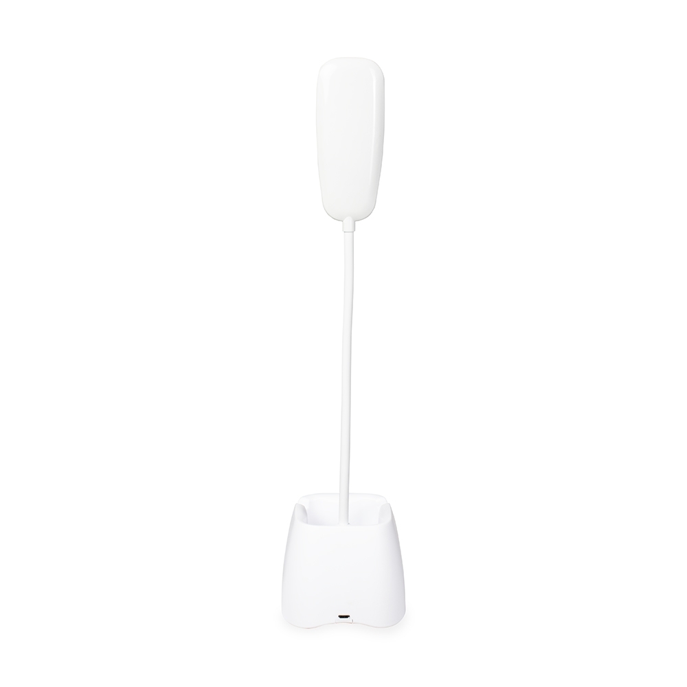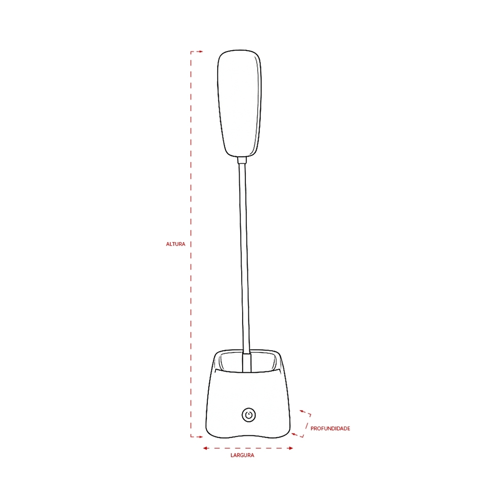 Descrição: Luminária recarregável com 18 LEDs, estrutura em plástico e haste articulável em múltiplos ângulos. Possui base com porta-canetas e acionamento por toque para a seleção de três níveis diferentes de iluminação. Acompanha cabo Micro USB para recarga.
