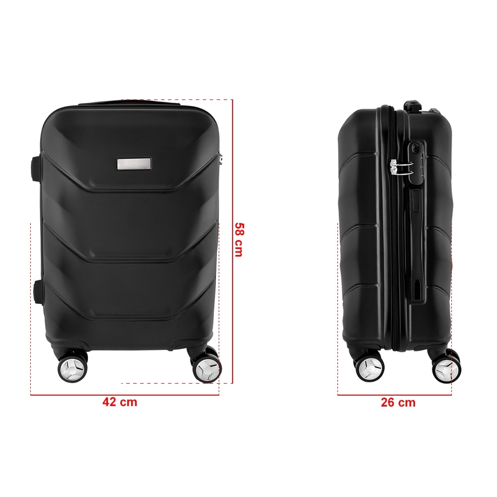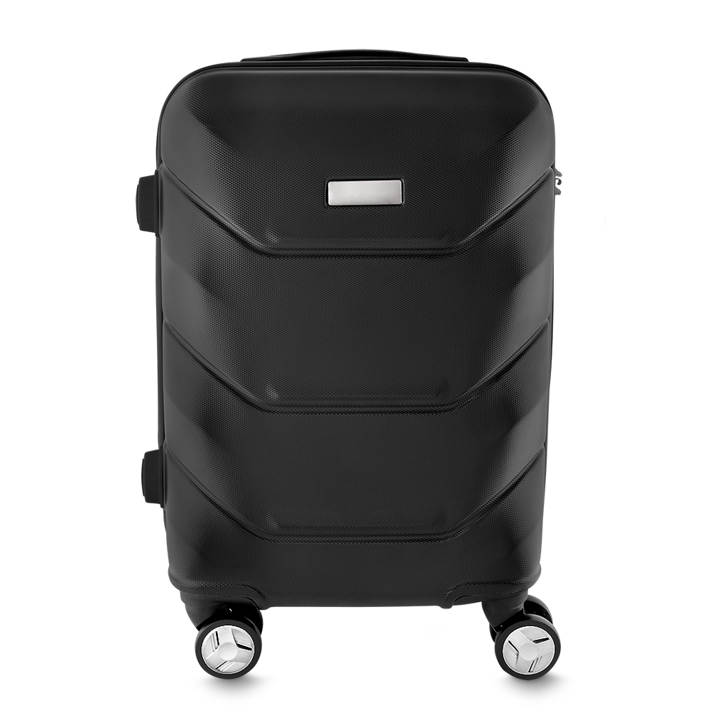 Mala de viagem média confeccionada em ABS com trava de segurança. Possui quatro rodinhas e apoiadores com borracha anti-deslizante para posicionar a mala na horizontal, alça de carrinho com botão para ajuste de tamanho; placa central para personalização; forro de poliester e compartimentos internos de zíper além de um cinto protetor.