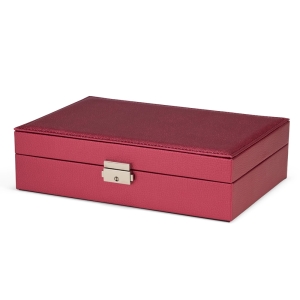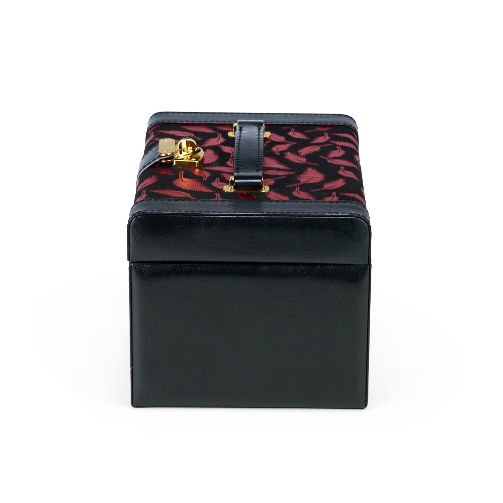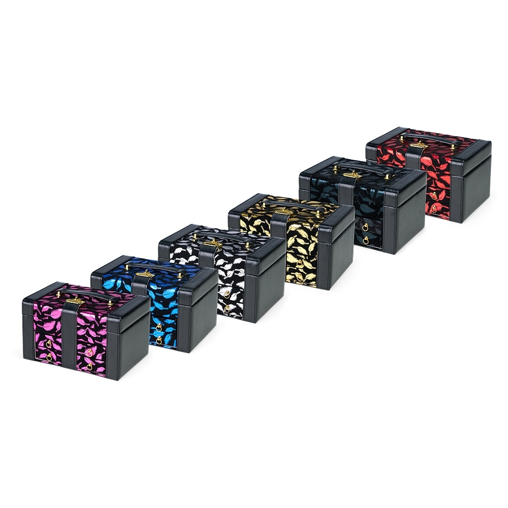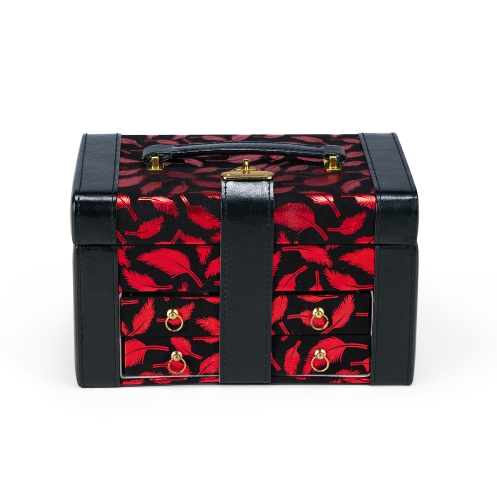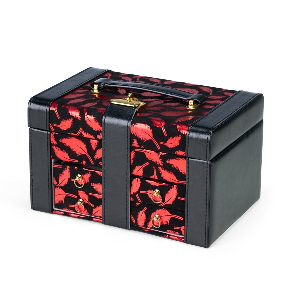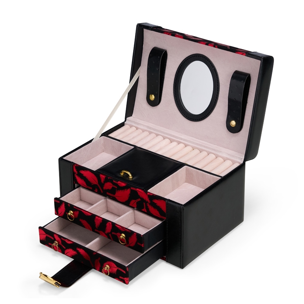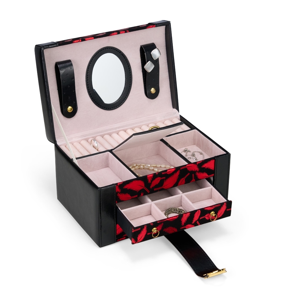 Maleta porta-joias em couro sintético com detalhes em veludo, trava metálica para fechamento e duas gavetas com divisórias removíveis. Possui revestimento interno aveludado, espelho oval e duas tiras em couro sintético para guardar brincos de pino, além de cinco divisórias de tamanhos variados, incluindo uma com tampa e outra com almofadas para anéis.