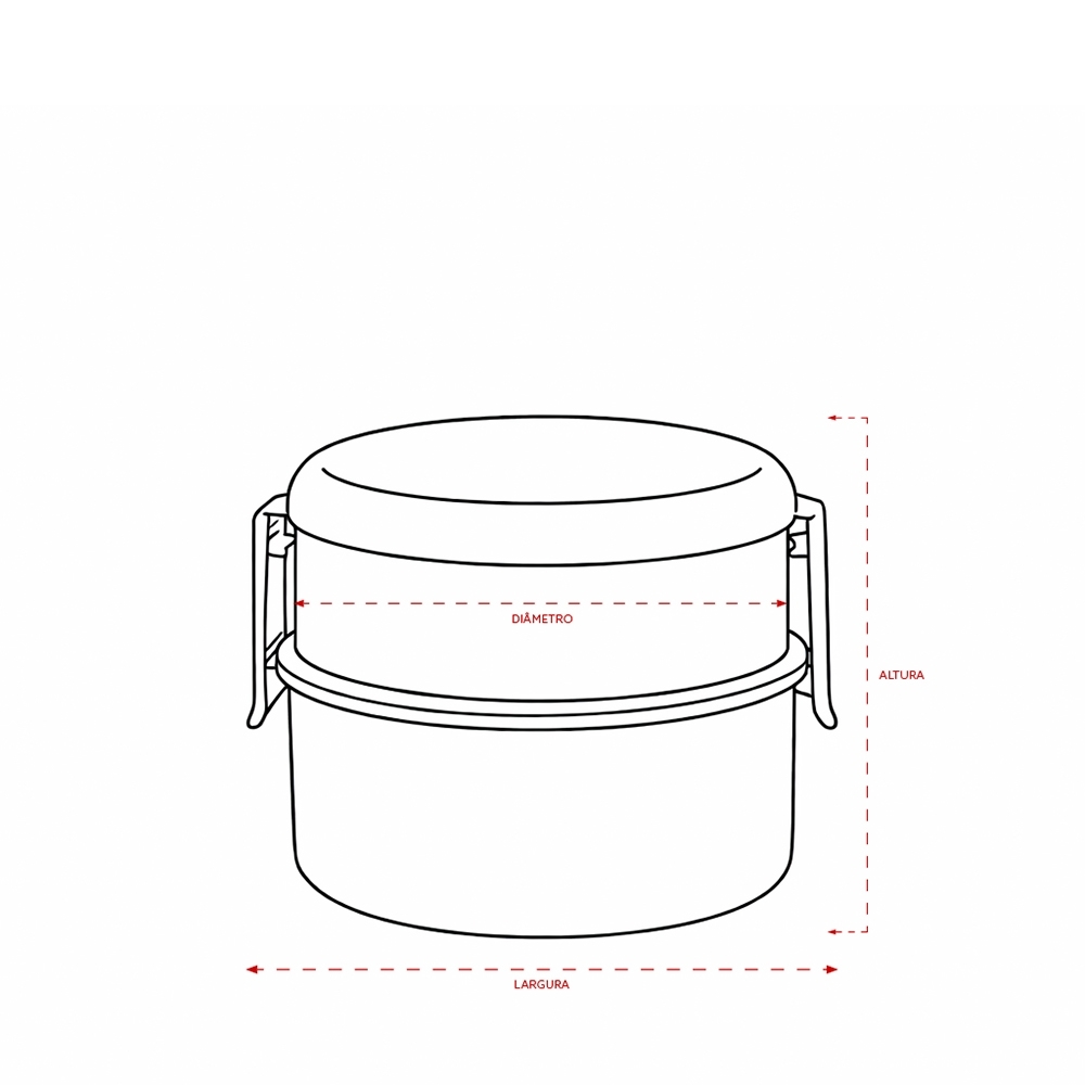 Marmita dupla em plástico livre de BPA com capacidade total de até 700ml. Apresenta dois potes em tamanhos diferentes: o menor com capacidade para 300 ml e o maior para 400 ml. Possui uma tampa para o pote inferior e outra, com travas laterais, que permite unir ambos os potes.
