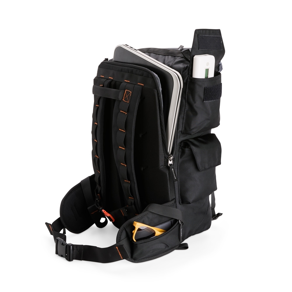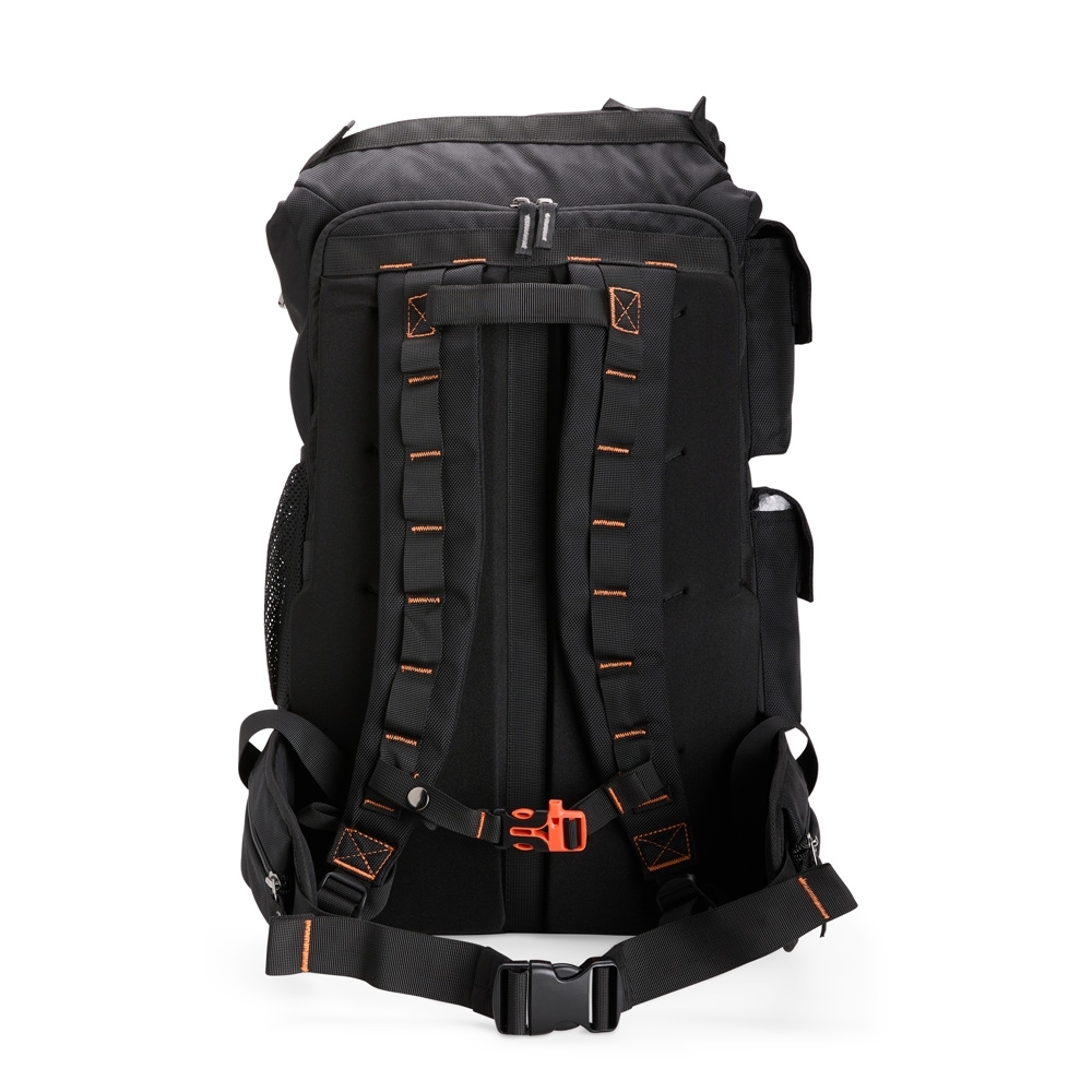 Descrição: Mochila confeccionada em poliéster impermeável, fechamento por cordão e engate rápido plástico e capacidade máxima de 25 litros. Possui amplo espaço interno com divisória com fechamento em velcro e bolso em tela de nylon próximo à abertura. Apresenta três compartimentos externos: um com fechamento em zíper e dois em velcro nas laterais, além de um bolso lateral em tela de nylon. A parte traseira da mochila conta com outros três compartimentos em diferentes tamanhos, incluindo espaço para notebooks de até 15,6 polegadas.