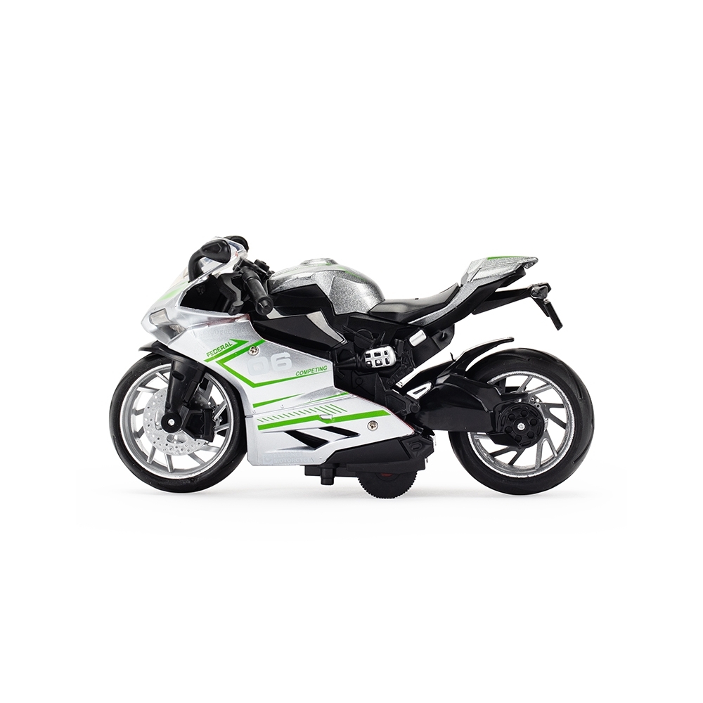 Moto esportiva em miniatura com estrutura em plástico. Possui mecanismo de fricção e acionamento de iluminação e efeitos sonoros por toque. Acompanha três baterias LR41.