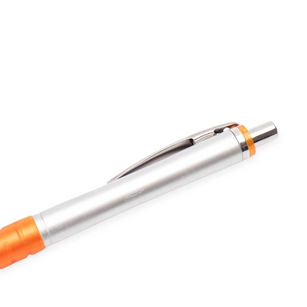 Pacote com 50 unidades de canetas plásticas com detalhes em metal, acionamento por clique e carga esferográfica azul de 1,0mm. Observação: as canetas do conjunto podem apresentar pequenos arranhões visíveis no corpo.