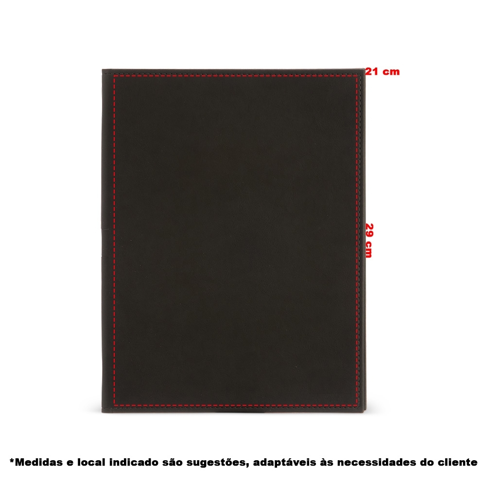 Pasta convenção de couro sintético, possui porta caneta, compartimento para arquivar documentos, dois bolsos para cartões e um bloco com aproximadamente 25 folhas brancas não pautadas.