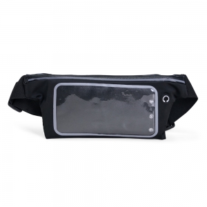 Pochete esportiva confeccionada em poliéster filamentado resistente à água. Possui cinto ajustável com fivela plástica de encaixe, saída para fones de ouvido e três compartimentos com fechamento em zíper, sendo dois na parte frontal e um traseiro antifurto.