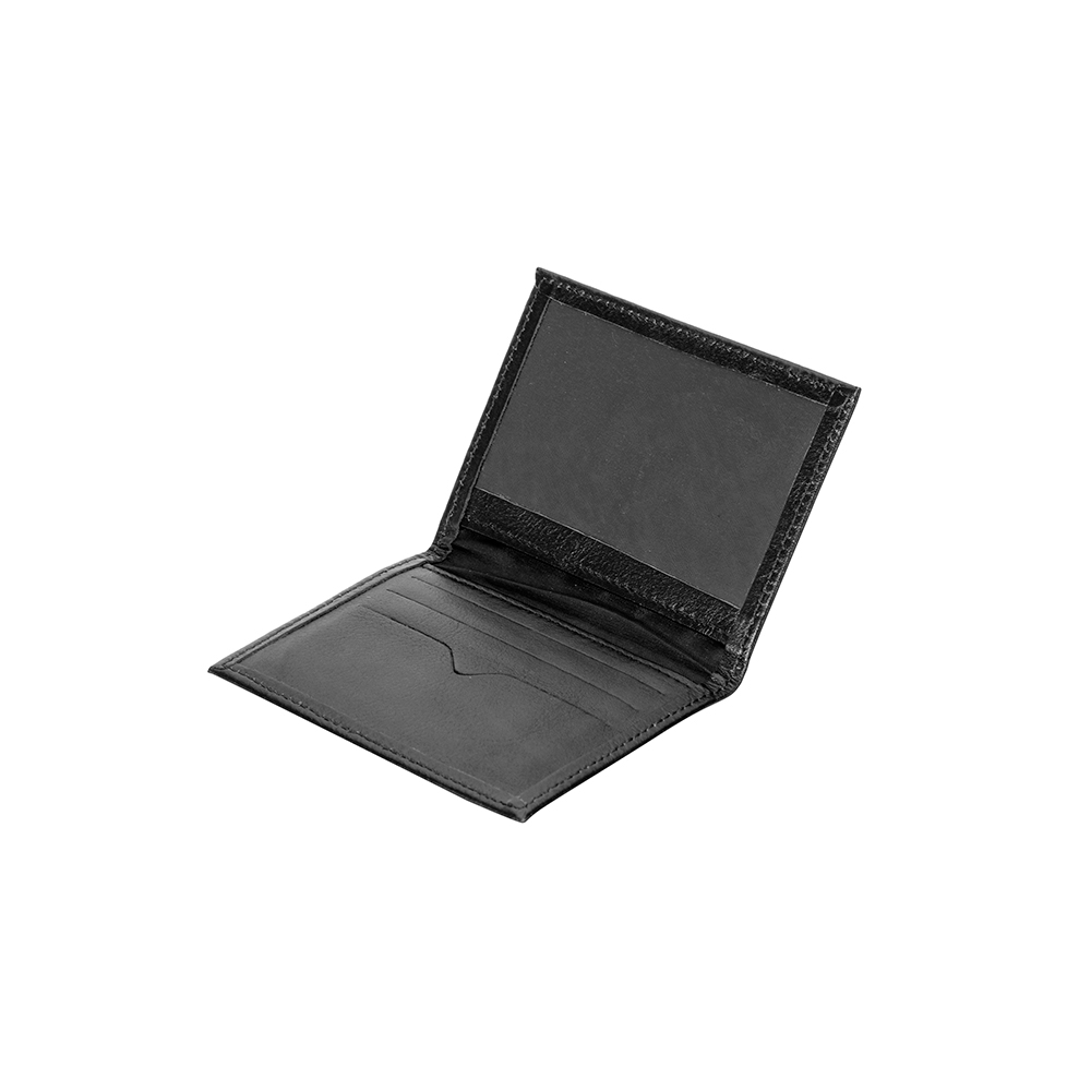 Descrição: Porta-cartão em couro com três divisórias para cartões e documentos, além de um bolso adicional com visor em plástico transparente.
