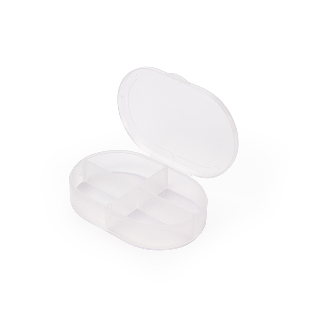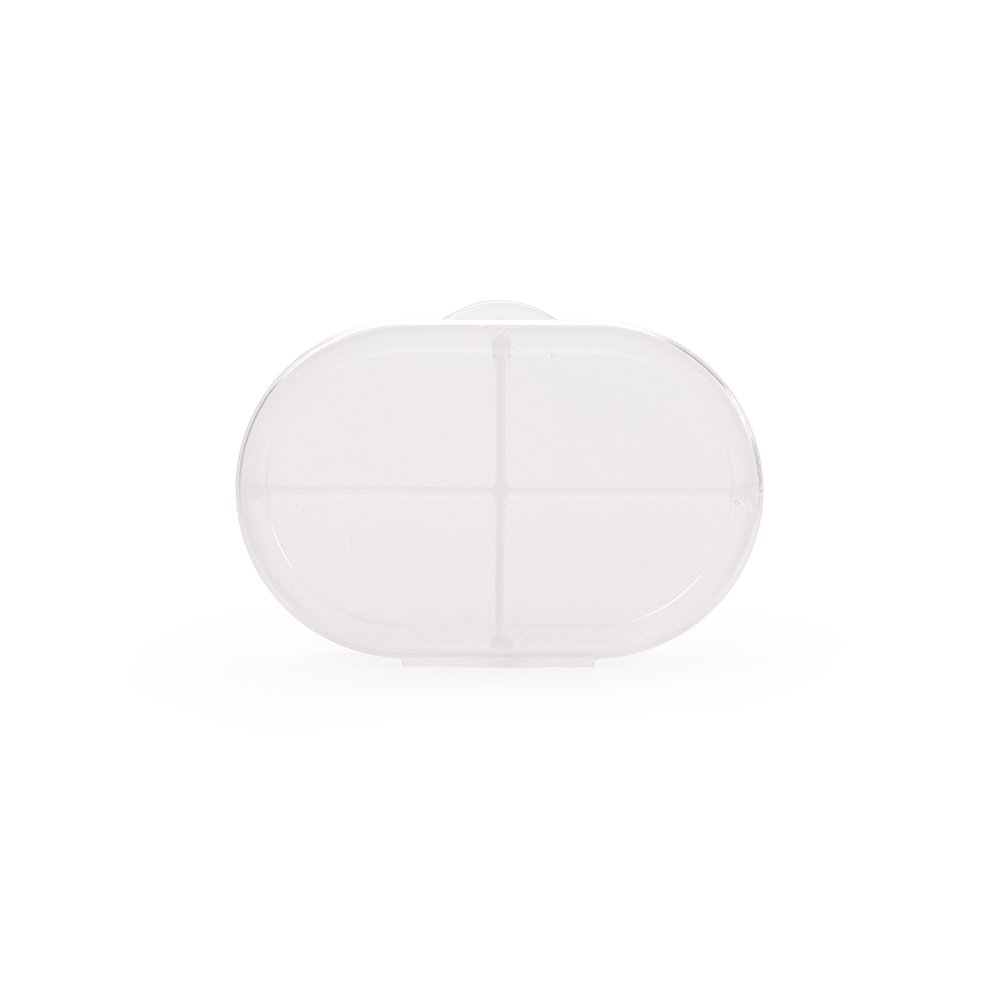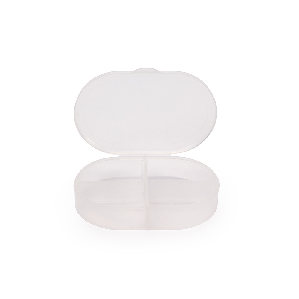 Porta-comprimidos em plástico com quatro divisórias, oferecendo mais opções para organizar medicamentos ou pequenos objetos.