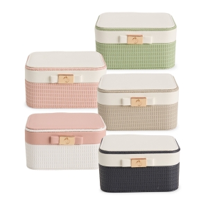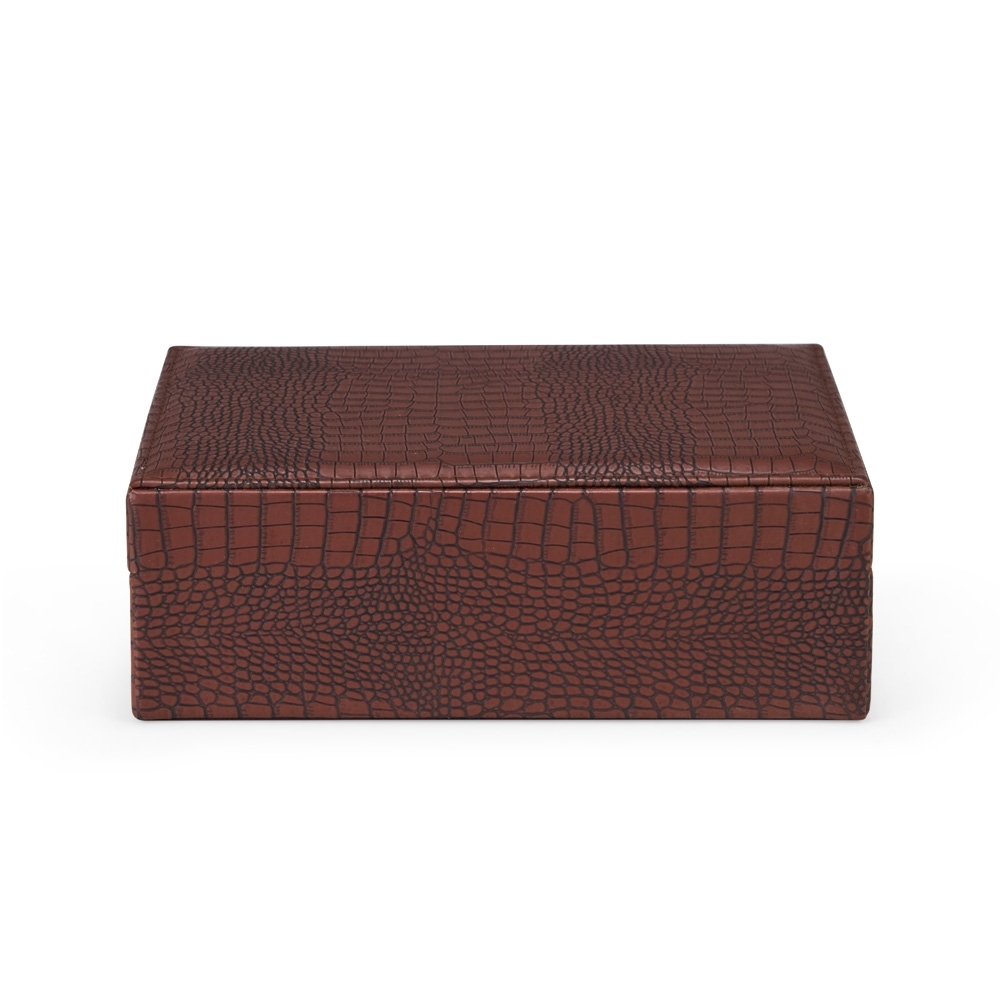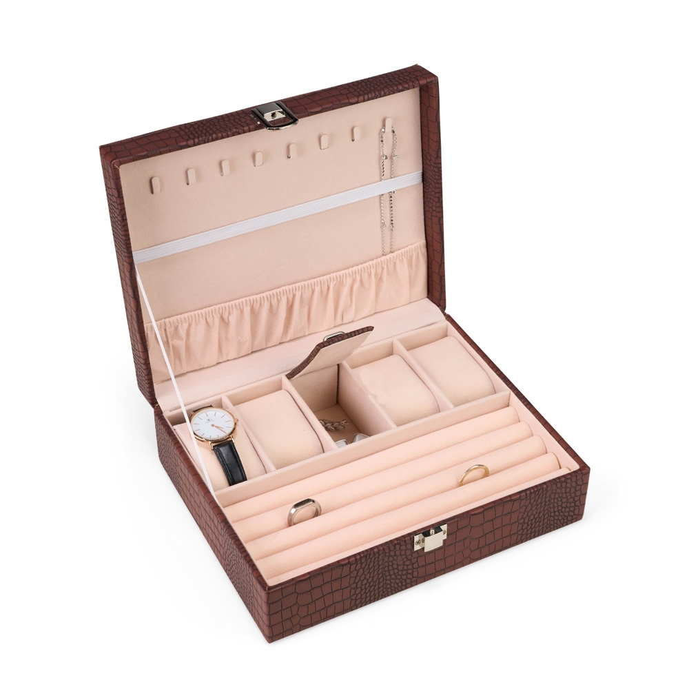 Porta-joias em couro sintético com textura crocodilo, trava de segurança para fechamento do estojo e revestimento interno aveludado. Possui oito ganchos e um bolso com elástico no interior da tampa, além de compartimento principal com seis divisórias: quatro com almofadas removíveis para relógios, uma com tampa e puxador metálico e outra com almofadas fixas para anéis e brincos.