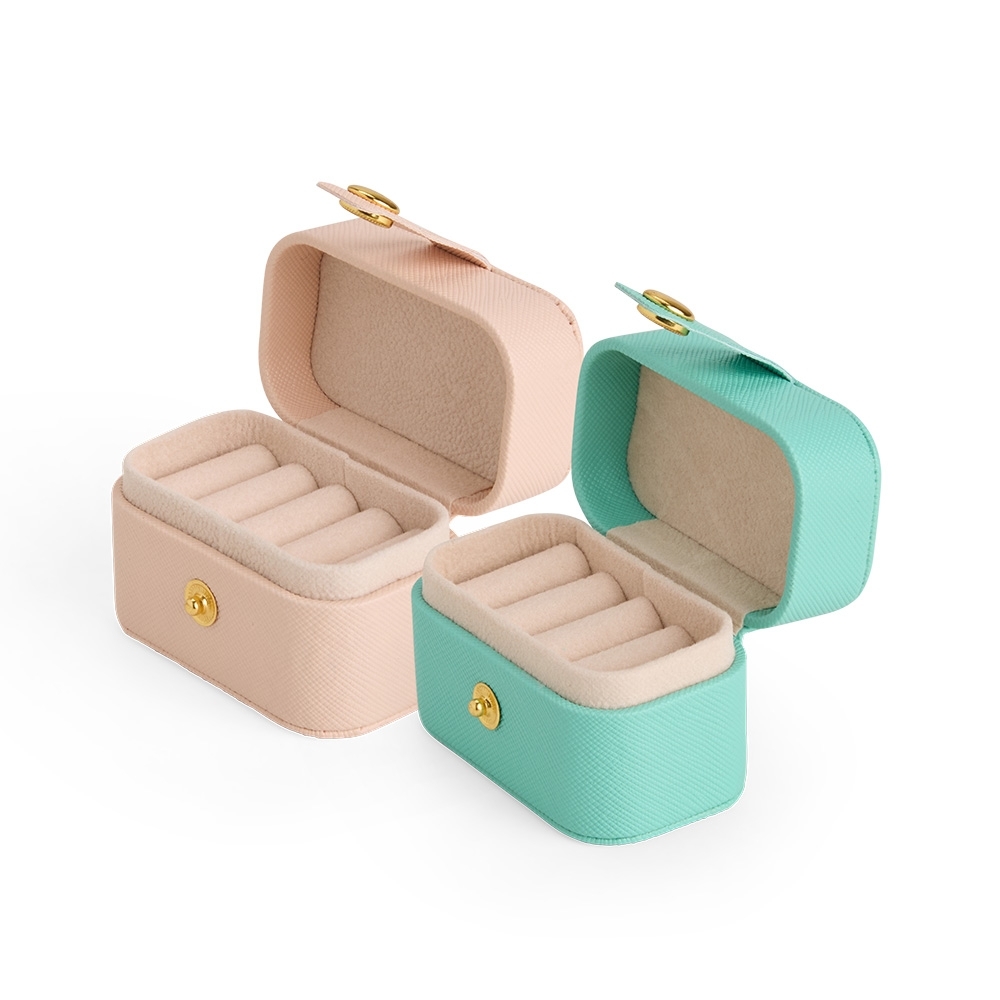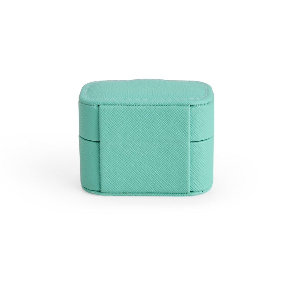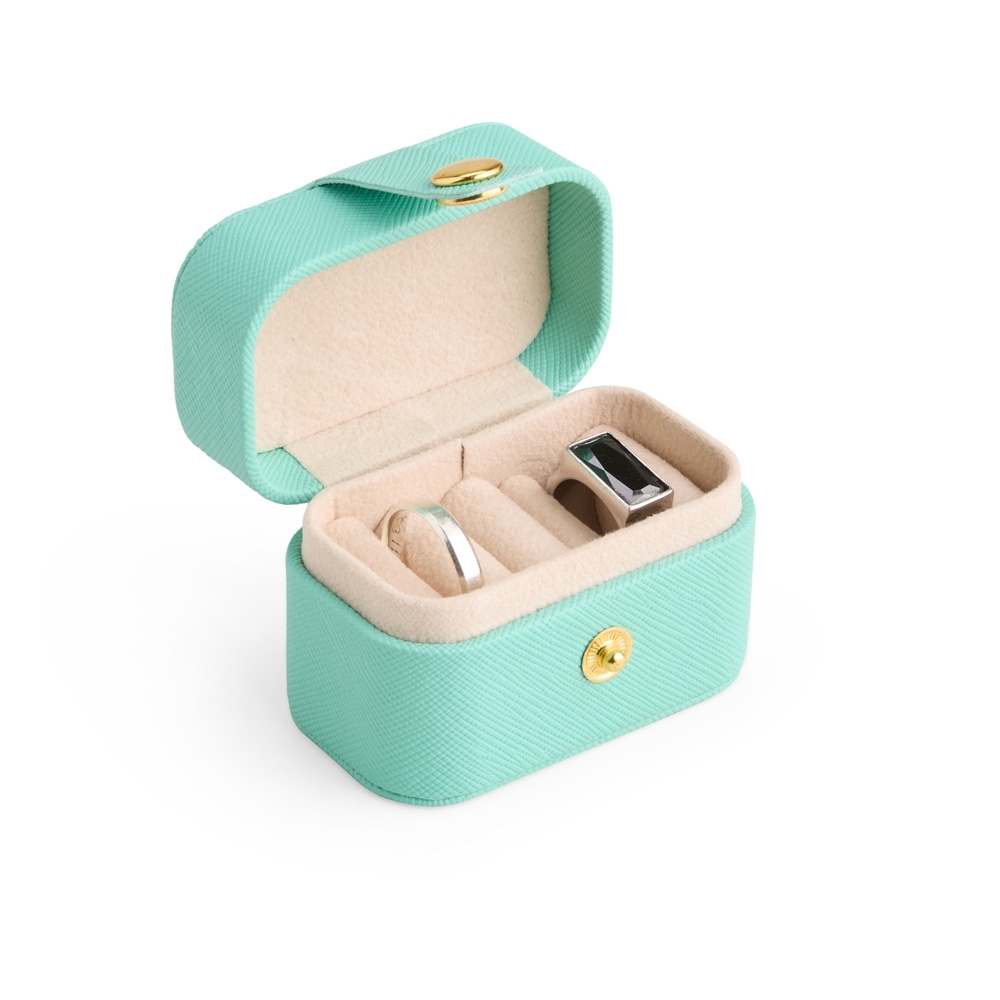 Descrição: Porta-joias em couro sintético com fechamento por botão metálico. Possui revestimento interno aveludado e almofadas fixas para anéis e brincos.