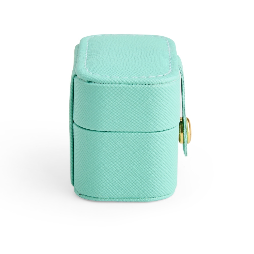 Porta-joias em couro sintético com fechamento por botão metálico. Possui revestimento interno aveludado e almofadas fixas para anéis e brincos.