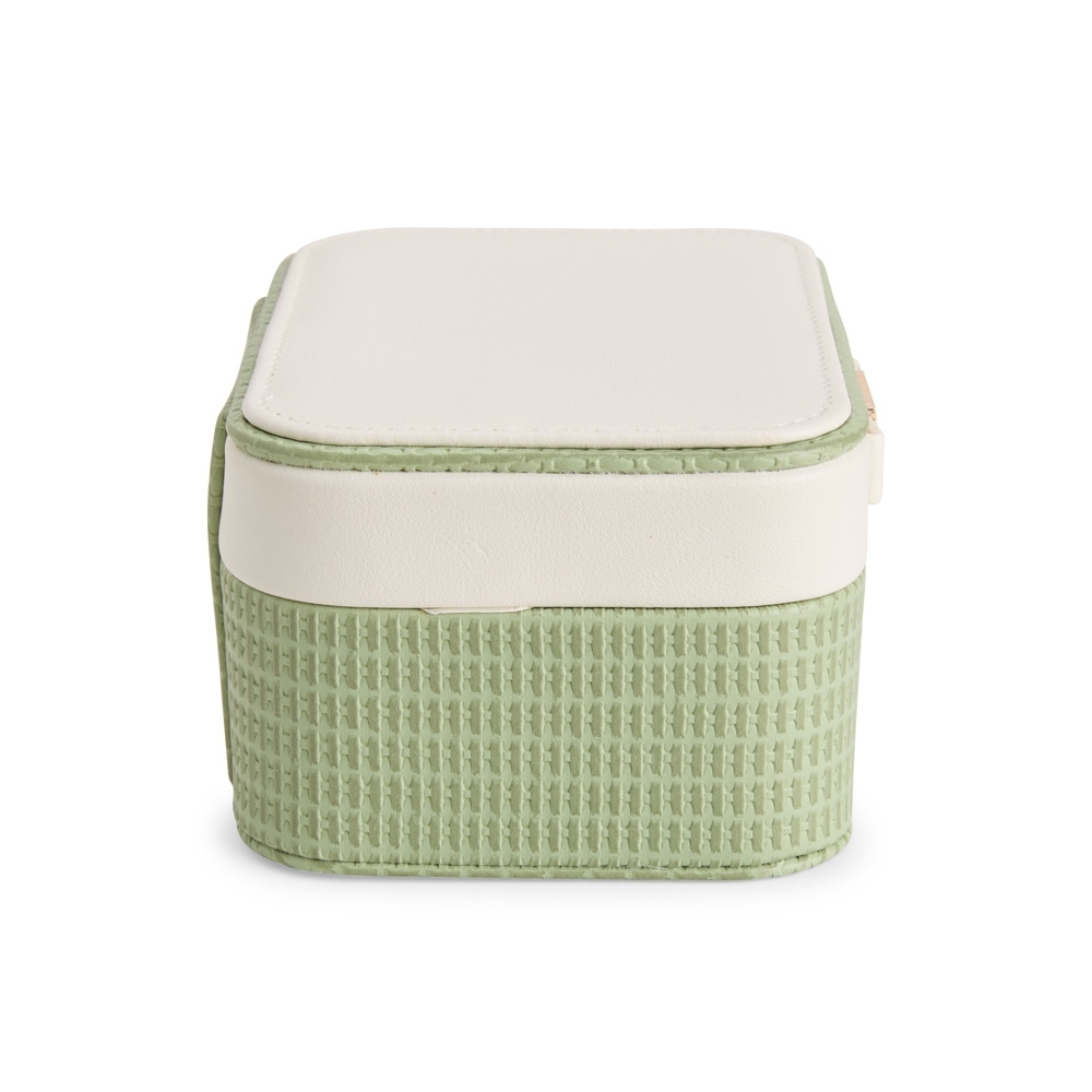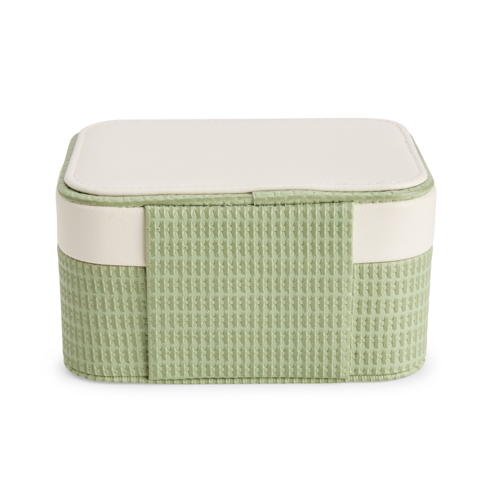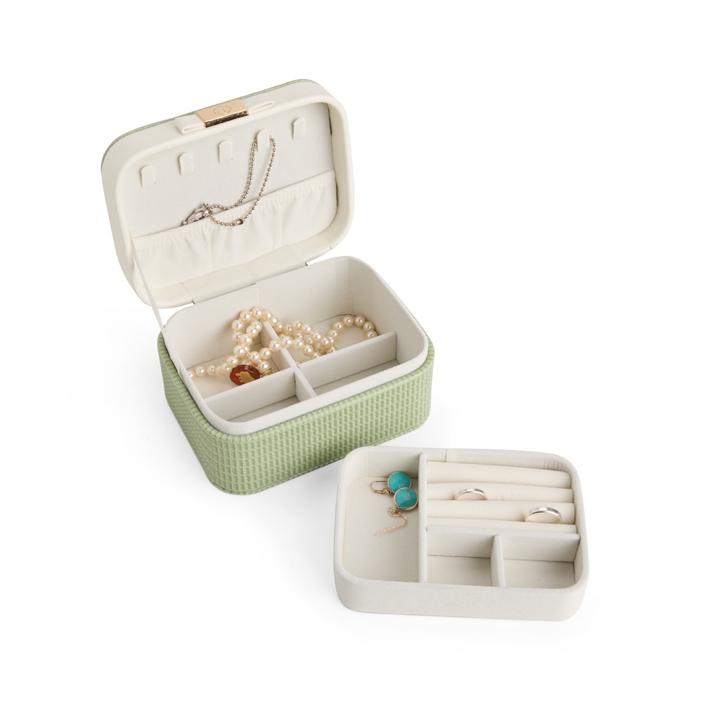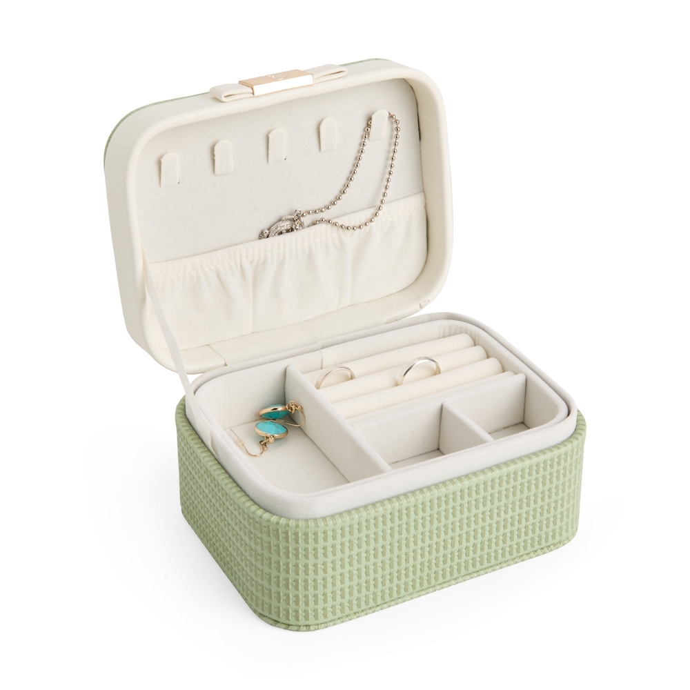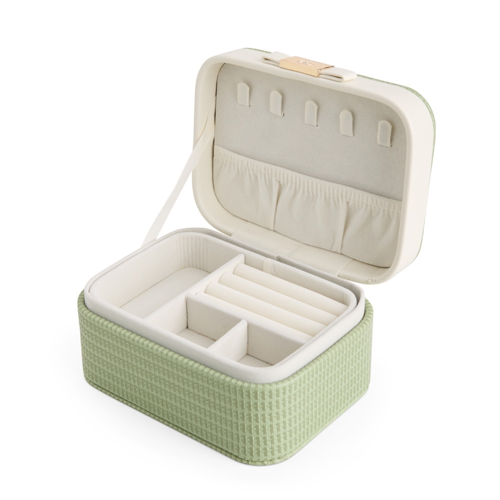 Descrição: Porta-joias em couro sintético texturizado, com detalhe frontal em metal e revestimento interno em veludo. Possui cinco ganchos e um bolso costurado na parte interna da tampa. Conta ainda com dois compartimentos internos principais: o superior, com divisórias em tamanhos diferentes, incluindo uma repartição almofadada para anéis e brincos; e o inferior com divisória removível.