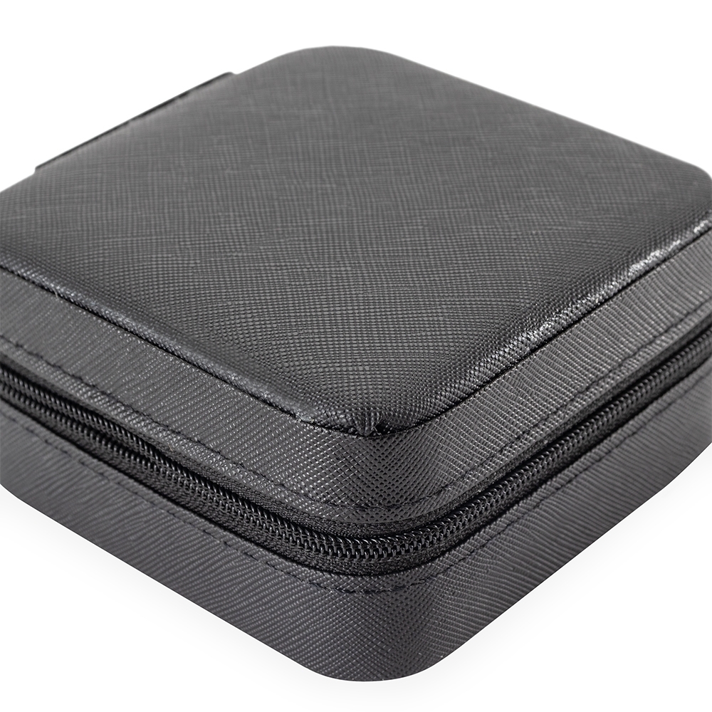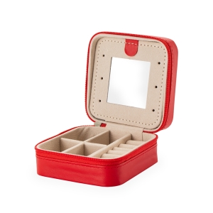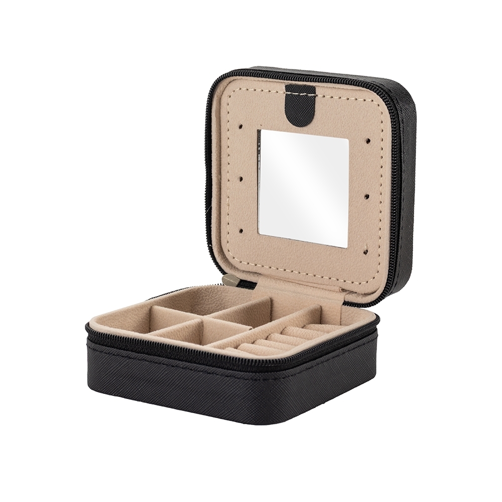 Porta-joias em couro sintético com fechamento em zíper. Possui revestimento interno em veludo, além de três ganchos pequenos, um bolso interno e uma divisória com espelho no interior da tampa. Conta ainda com compartimento removível com quatro divisórias e almofadas fixas para anéis. Apresenta marcas visíveis de cola no revestimento interno.
