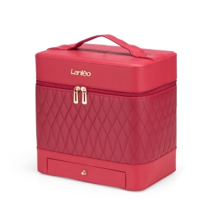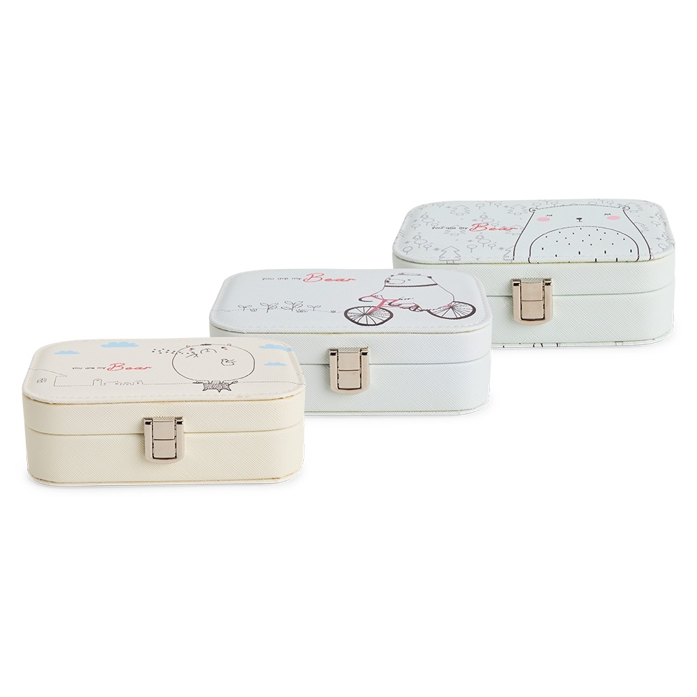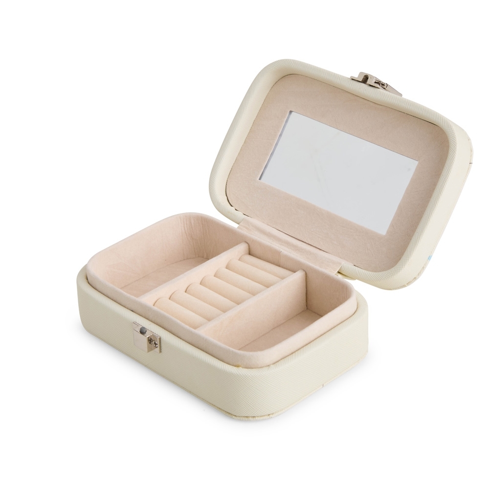Descrição: Porta-joias em couro sintético com trava de segurança para fechamento. Possui revestimento interno em veludo, espelho retangular no interior da tampa e três divisórias no compartimento principal, uma delas com almofadas para abrigar anéis e brincos.