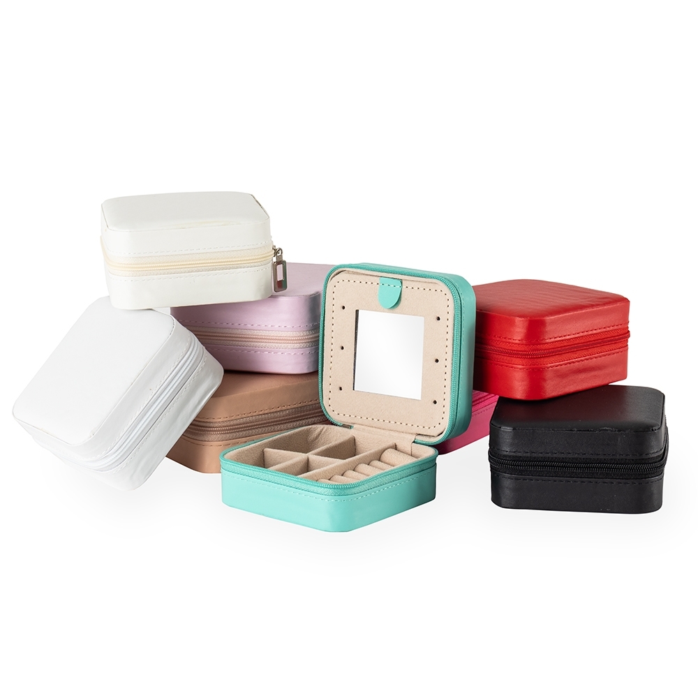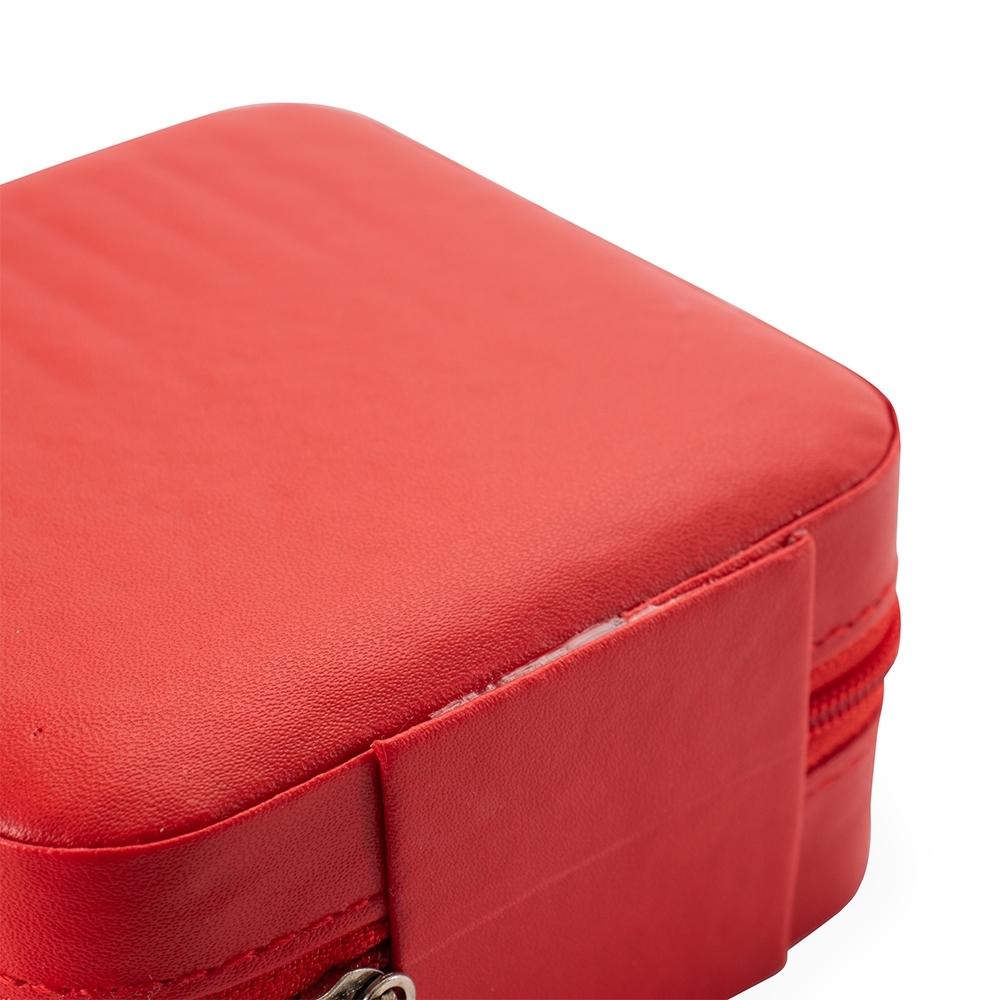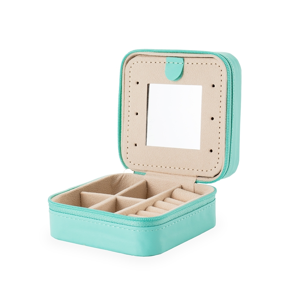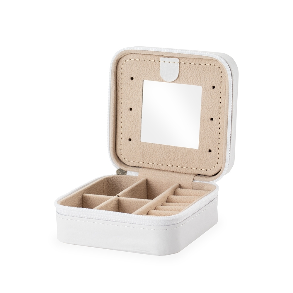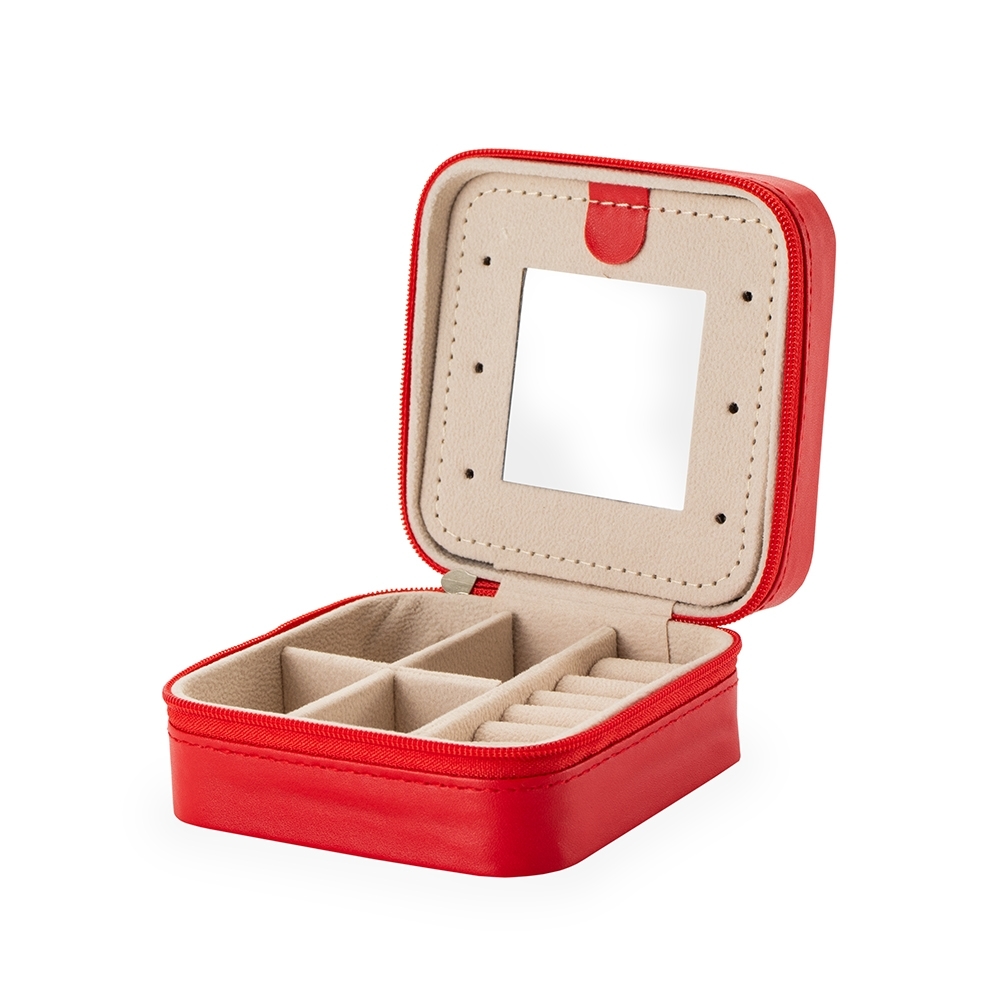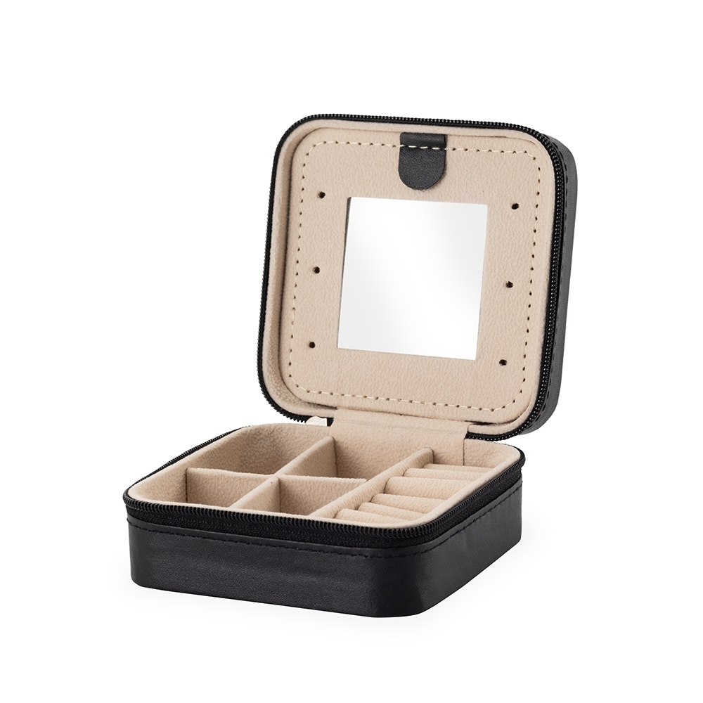 Porta-joias em couro sintético e fechamento em zíper. Conta com revestimento interno em veludo, três ganchos pequenos, um bolso interno e uma divisória com espelho na parte interior da tampa. Possui também compartimento removível com quatro divisórias e almofadas fixas para anéis. Apresenta marcas visíveis de cola no revestimento interno.