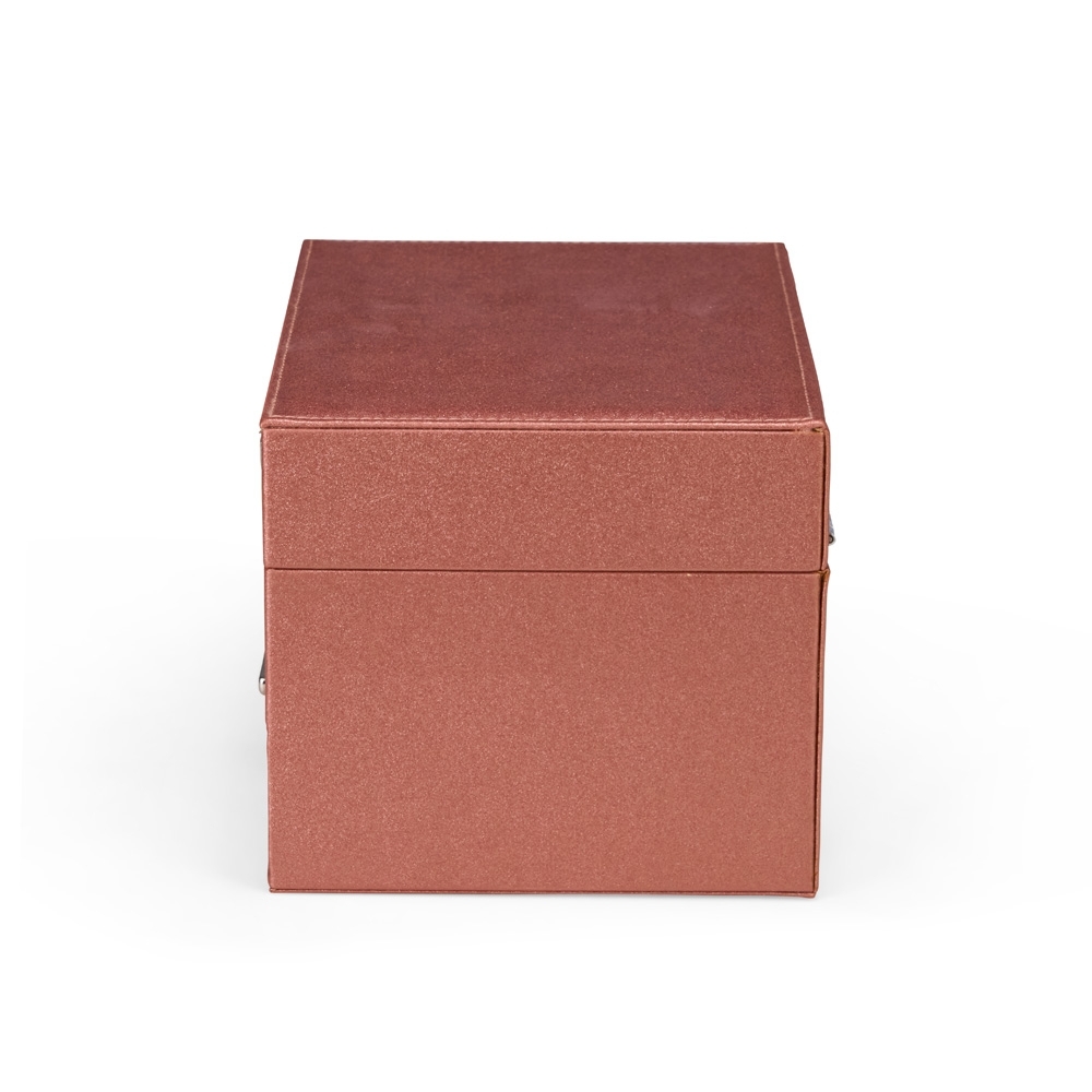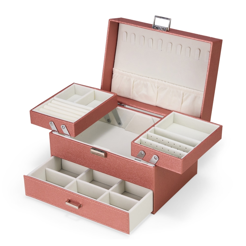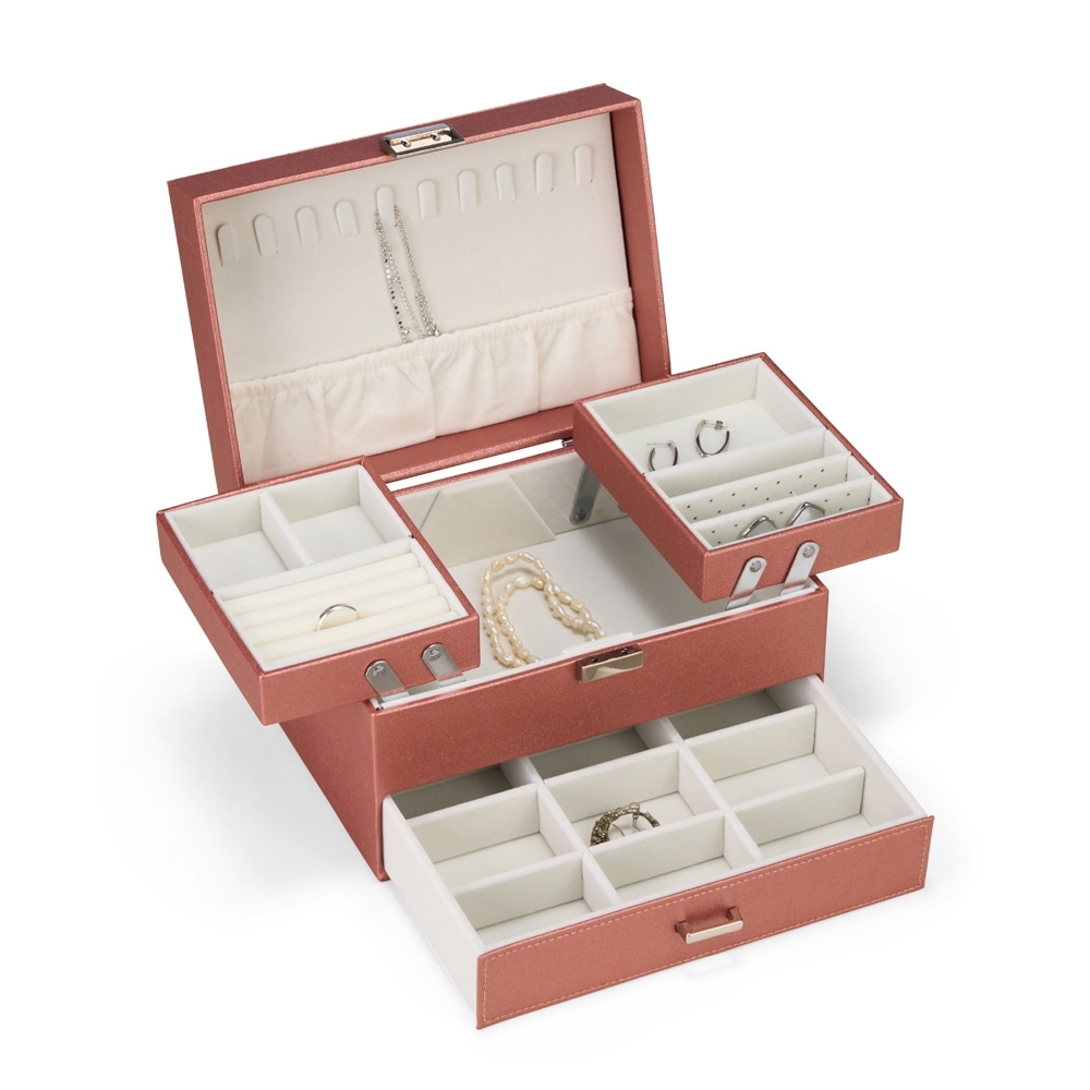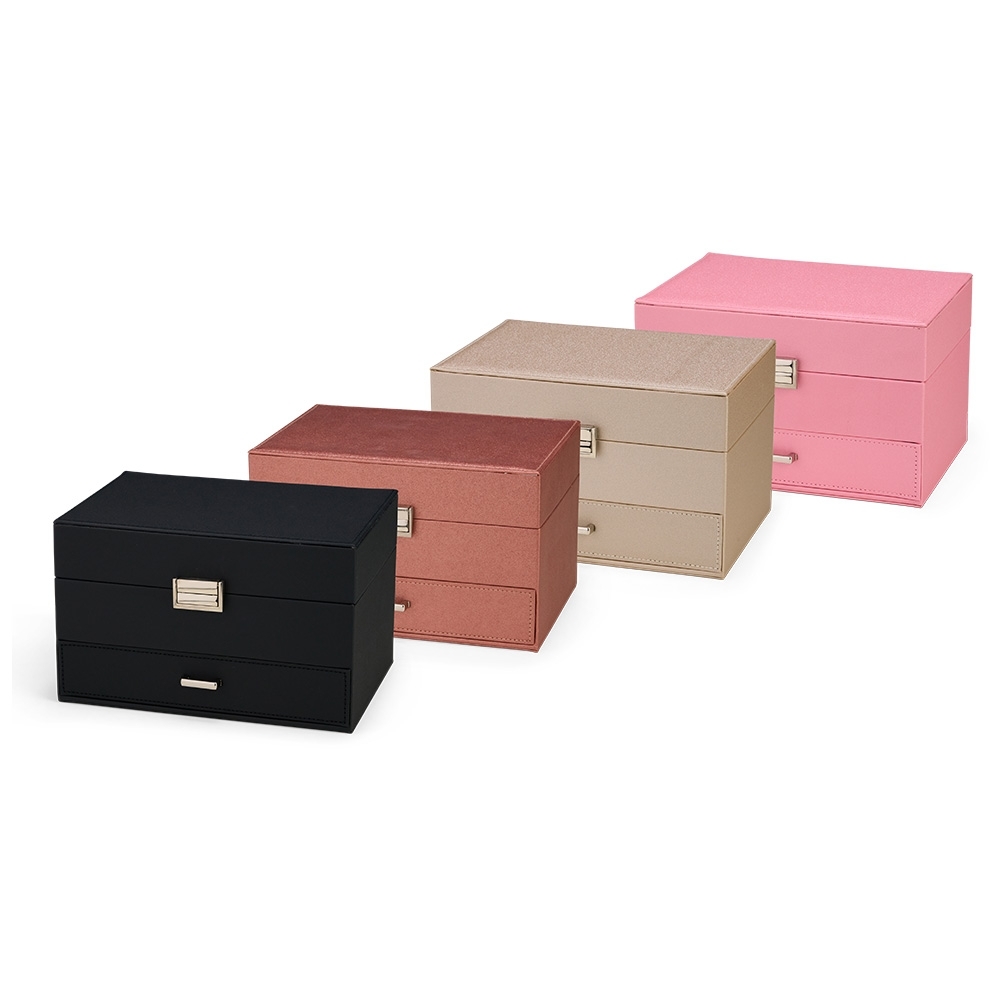 Porta-joias em couro sintético com trava de fechamento em metal e uma gaveta com puxador e divisórias removíveis. Possui revestimento interno em veludo, além de dez ganchos e um bolso com elástico na parte interna da tampa. Apresenta ainda duas bandejas móveis com divisórias de tamanhos diferentes, permitindo a organização de itens variados.