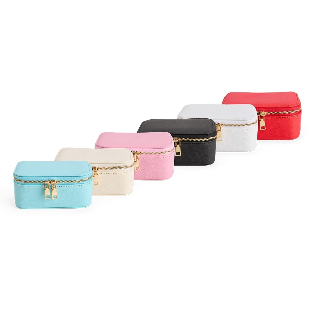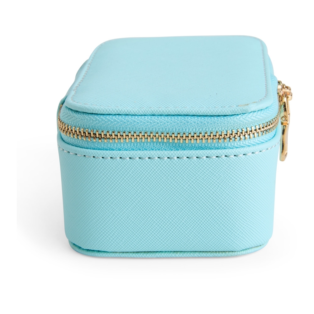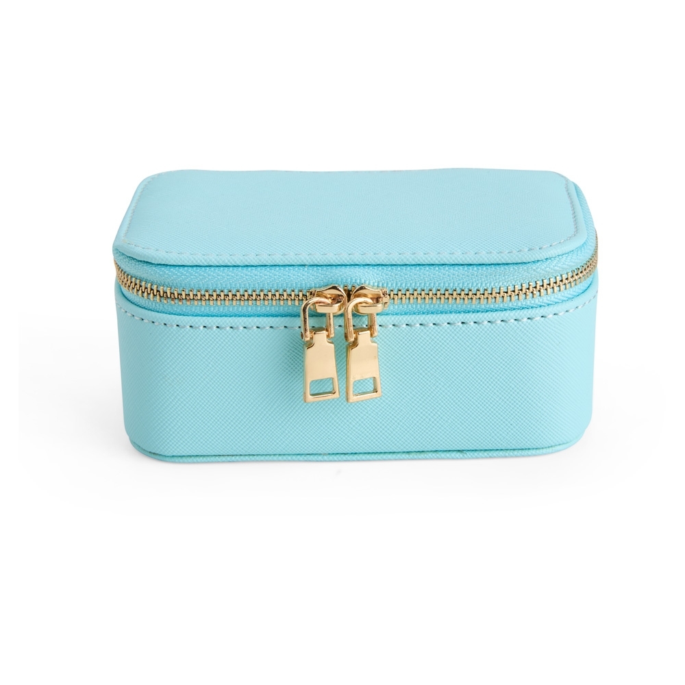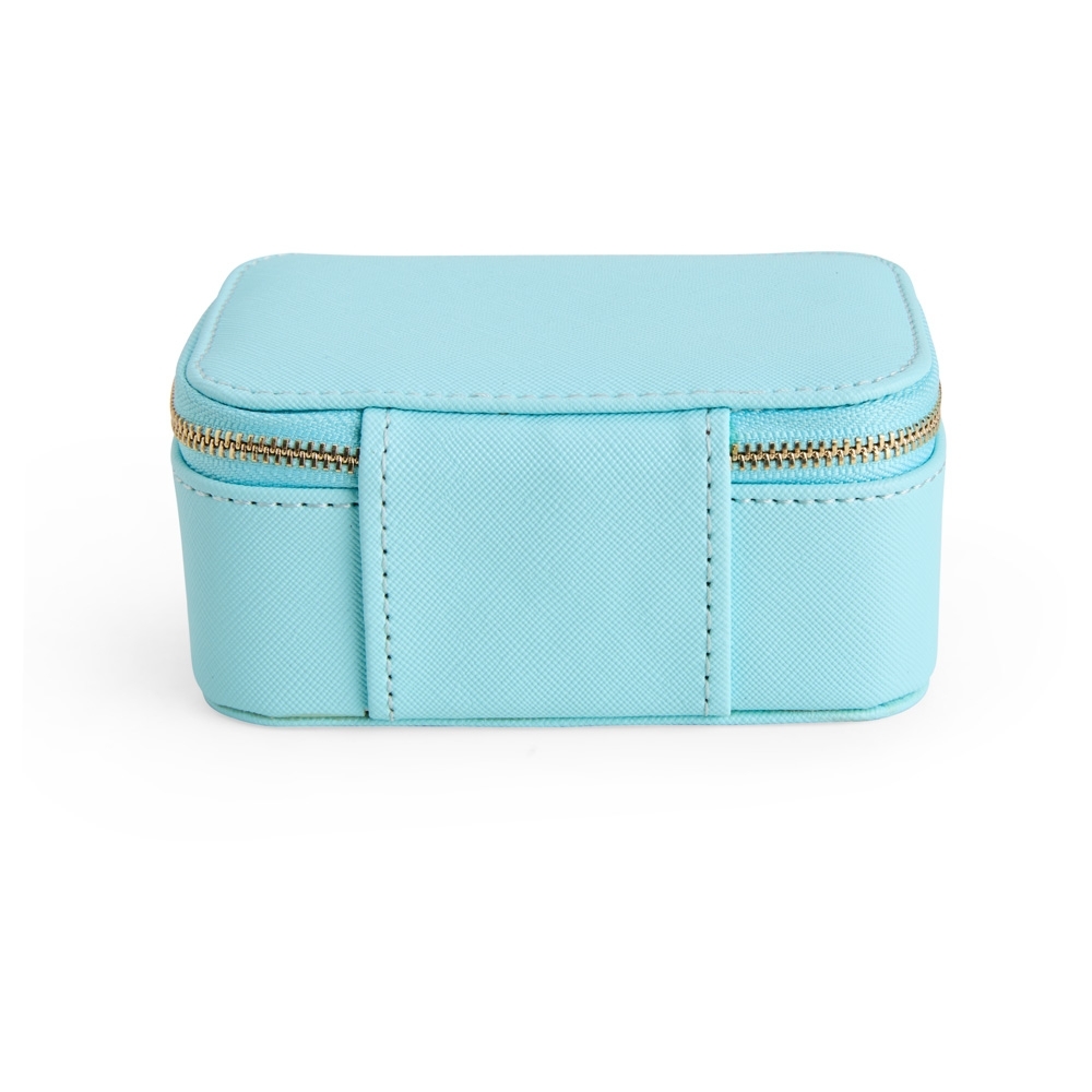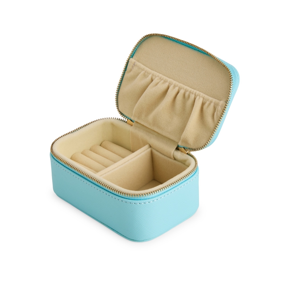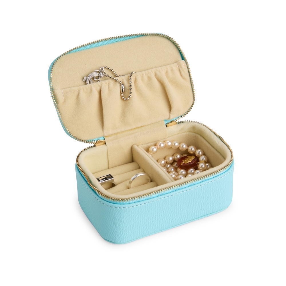 Porta-joias em couro sintético levemente texturizado, fechamento em zíper com dois puxadores e revestimento interno em veludo. Possui bolso com elástico na parte interna da tampa e duas divisórias principais, uma delas com almofadas para anéis e brincos.