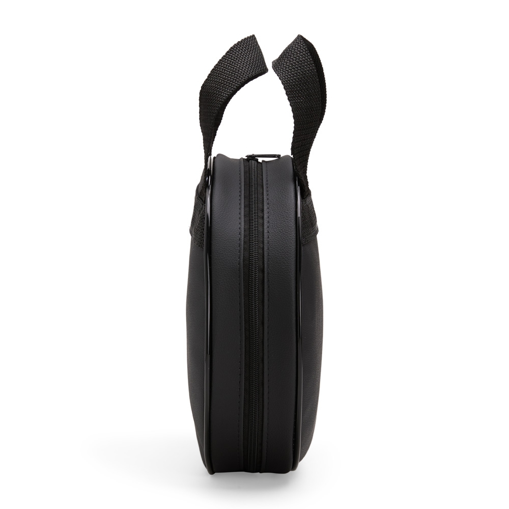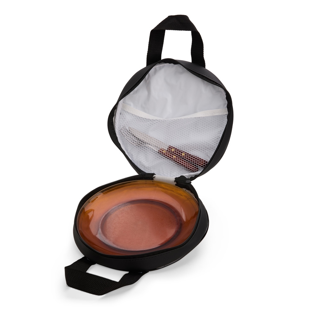 Bolsa porta-pratos em couro sintético e fechamento em zíper. Possui compartimento interno que inclui bolso em tela de nylon, além de duas alças para transporte.