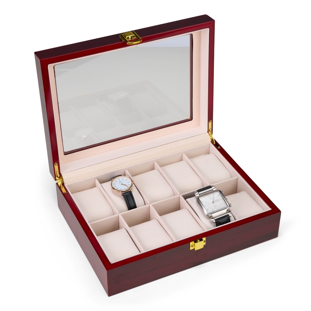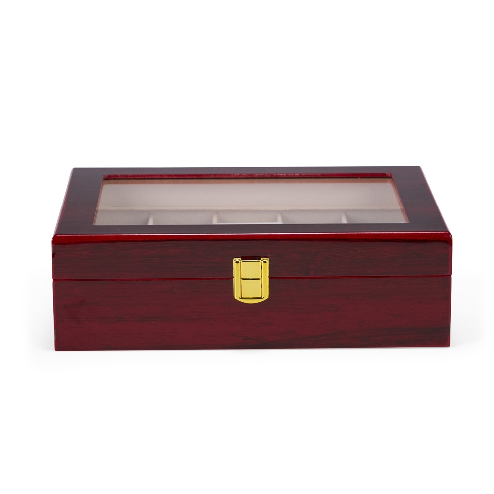 Descrição: Porta-relógios com estrutura em MDF de acabamento liso, dobradiças metálicas e revestimento interno em veludo. Conta com 10 divisórias com almofadas removíveis, visor em vidro e trava de segurança em metal para fechamento da tampa.