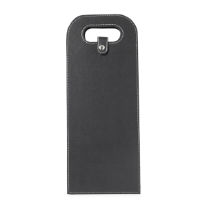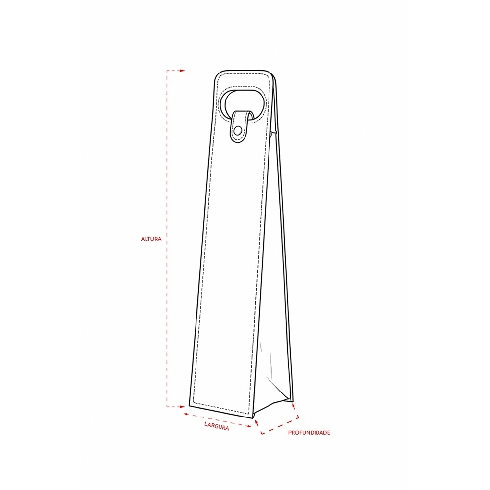 Descrição: Porta-vinho confeccionado em couro sintético e estrutura interna em papelão. Possui alça de mão vazada e fechamento em botão metálico.