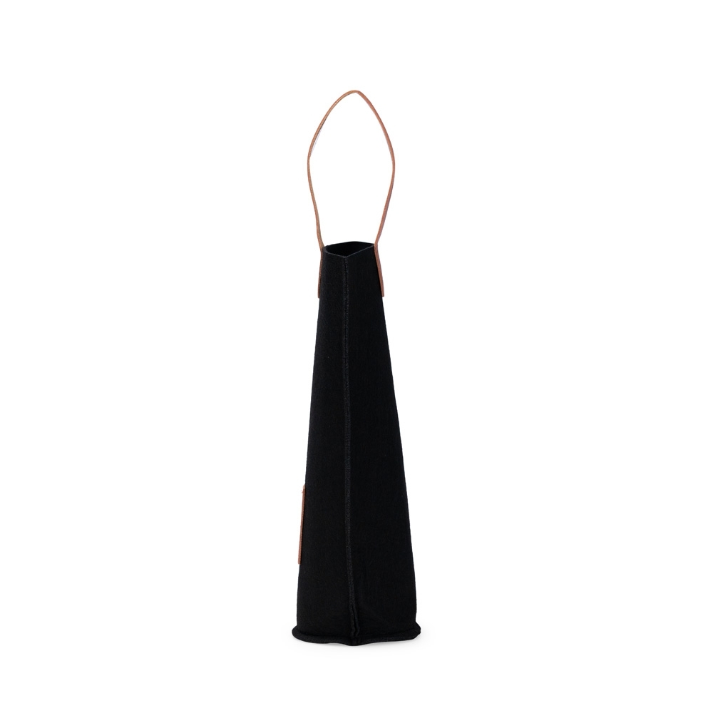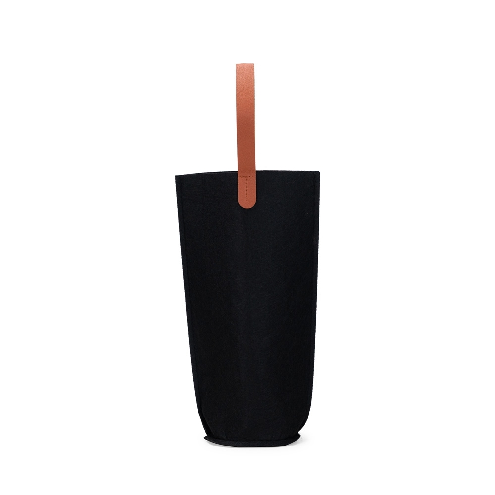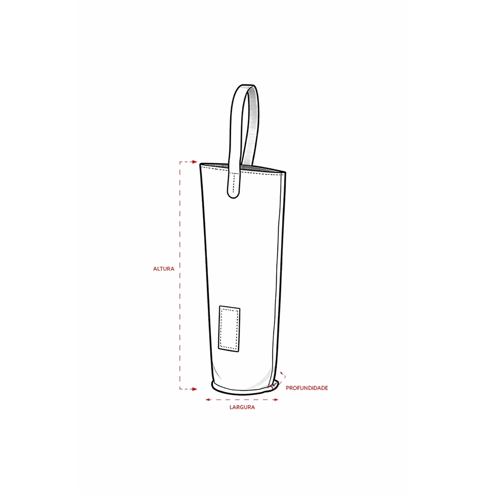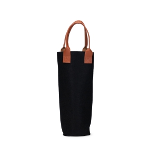 Descrição: Sacola porta-vinho confeccionada em feltro com alças de mão e plaquinha retangular frontal em couro sintético.