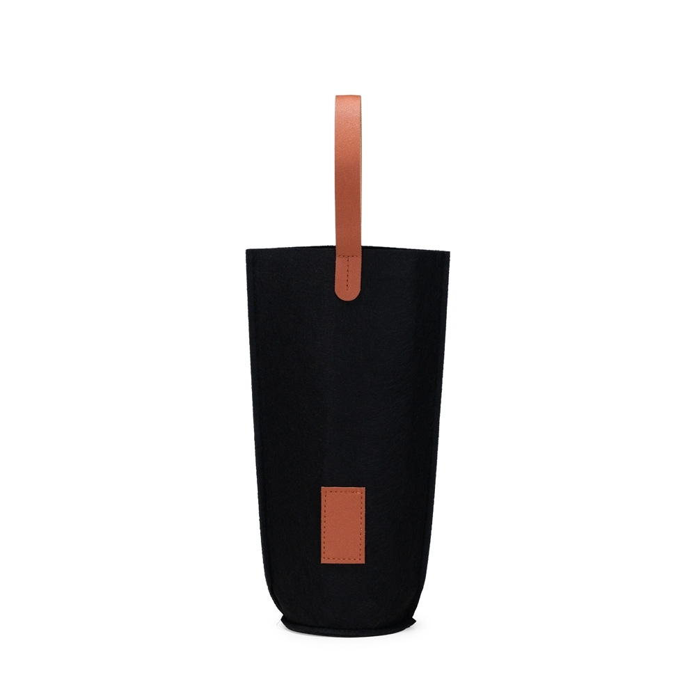 Sacola porta-vinho confeccionada em feltro com alças de mão e plaquinha retangular frontal em couro sintético.