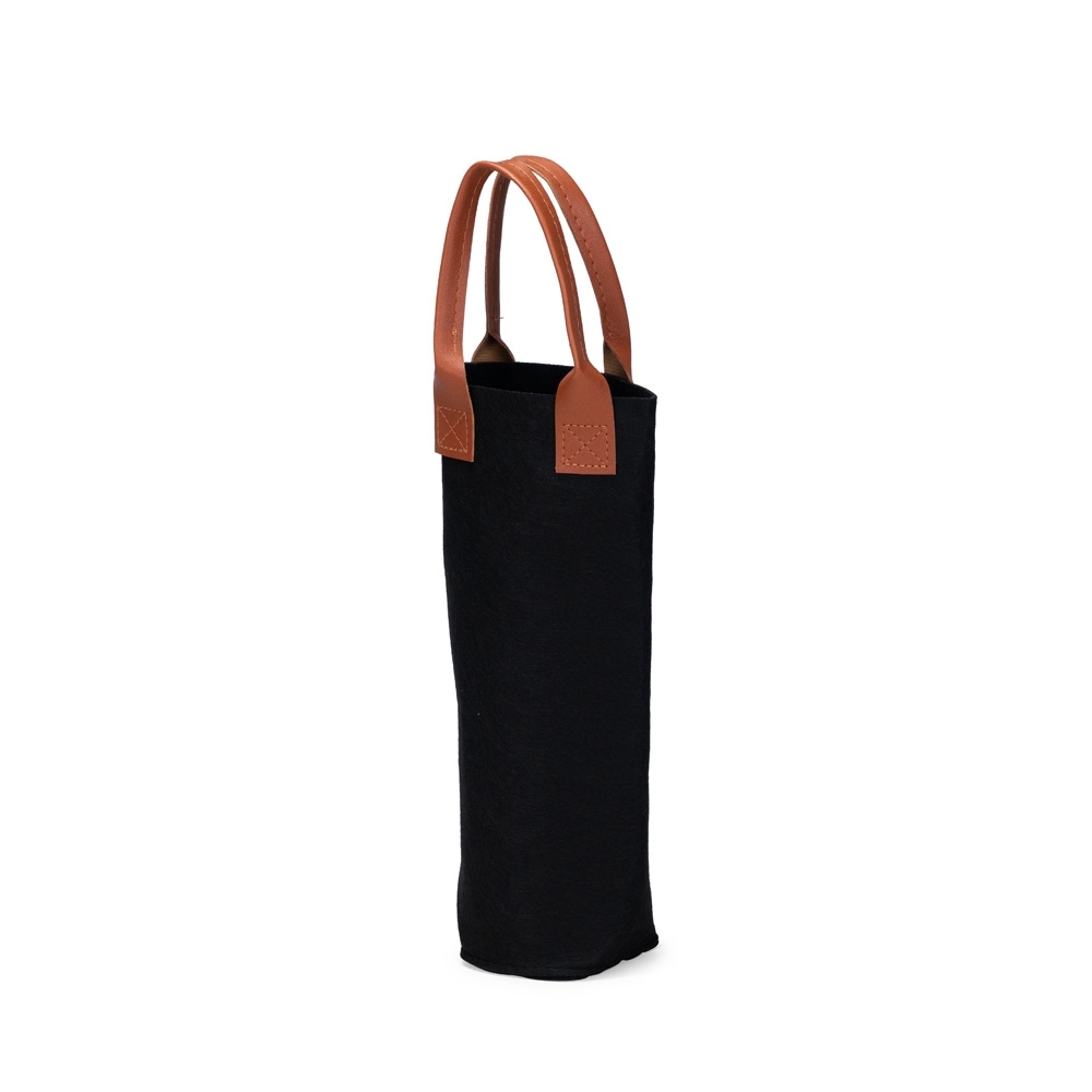 Sacola porta-vinho confeccionada em feltro e alças de mão em couro sintético.