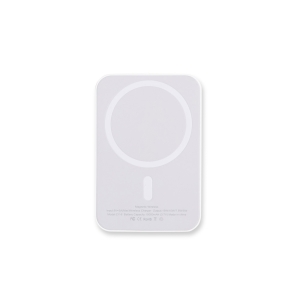 Power bank para carregamento de dispositivos compatíveis com a tecnologia de indução magnética, estrutura em plástico, entrada USB-C para alimentação e capacidade de até 10.000mAh.