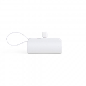 Descrição: Power bank plástico de 10.000mAh com indicadores led de bateria e cabos acoplados: Tipo-C e V8. Acompanha cabo USB V8 e adaptador Lightning.