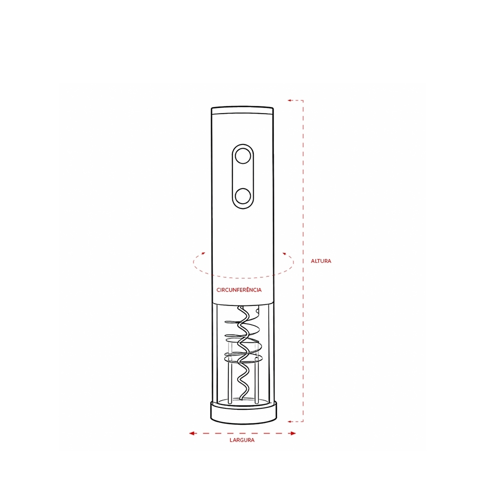 Saca-rolhas elétrico recarregável com estrutura em liga de alumínio, ABS, policarbonato e aço carbono, além de painel com iluminação em LED e botões de controle. Acompanha cabo USB-C para carregamento.