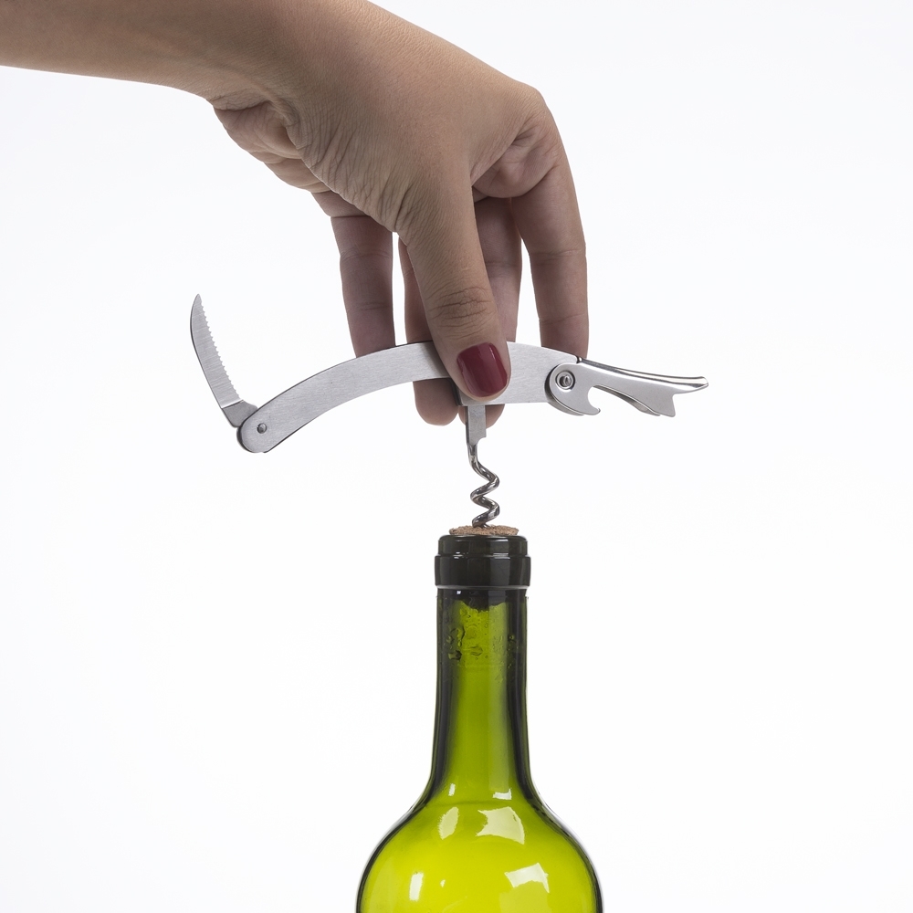 Descrição: Saca-rolhas metálico com lâmina de corte e abridor de garrafa.
