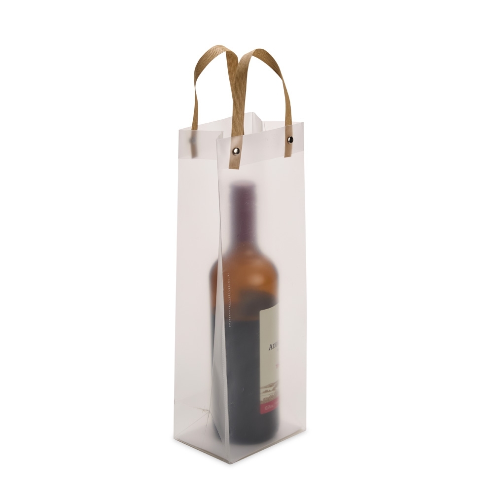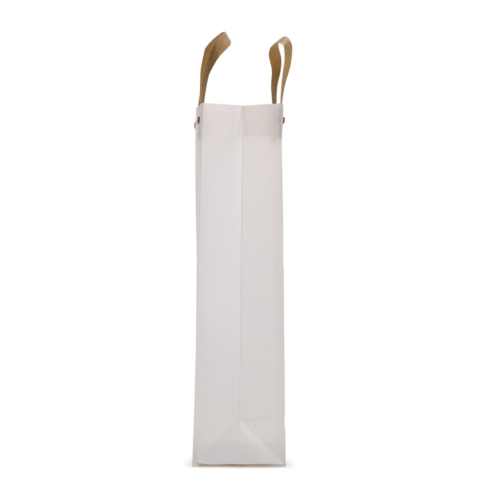 Descrição: Sacola plástica com formato retangular, acabamento fosco e alças em papelão fixadas por botões metálicos.