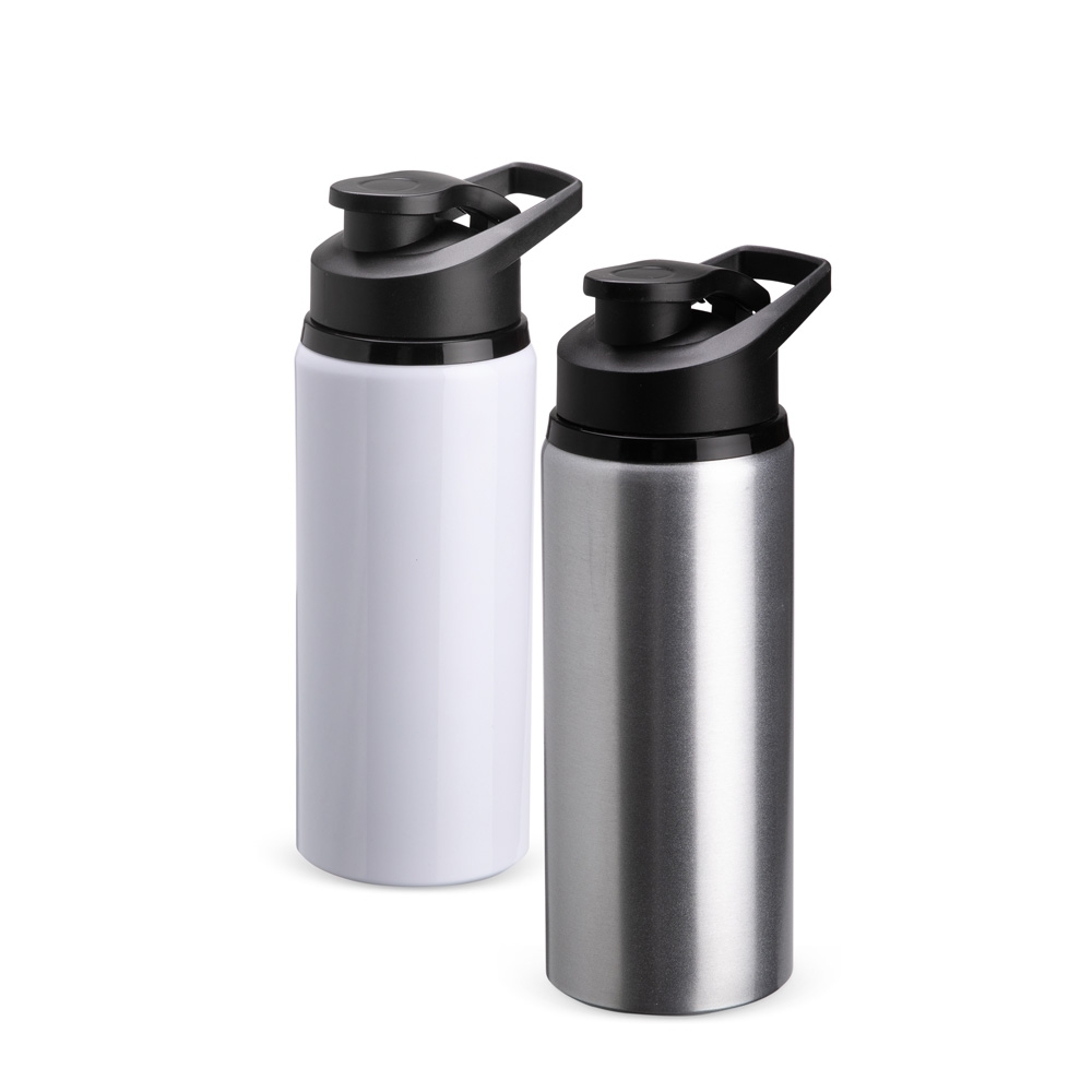 Squeeze em alumínio com pintura de acabamento para sublimação e capacidade máxima de 650ml. Possui tampa rosqueável em plástico com alça fixa e tampa protetora para o bocal.