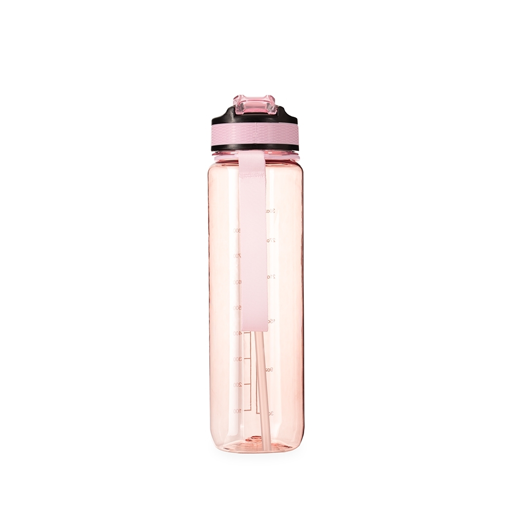 Descrição: Squeeze plástico livre de BPA com capacidade máxima de 1,05L e marcação de volume de até 1L. Possui tampa rosqueável com bico flip, tampa protetora, botão de acionamento com trava de segurança. Acompanha canudo interno em plástico e alça para transporte em nylon.